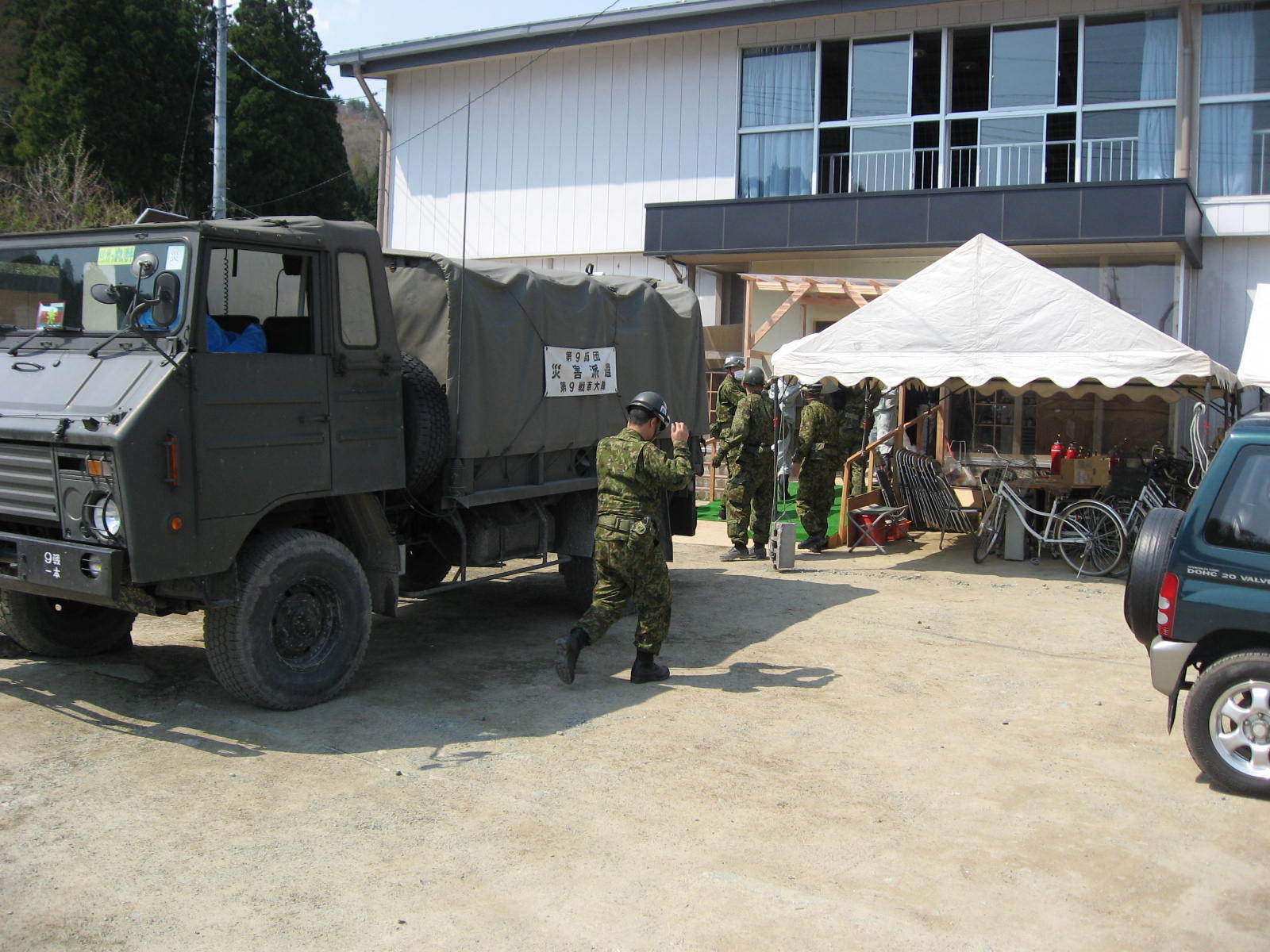 トラックから救援物資を被災地に運び出している自衛隊員の様子