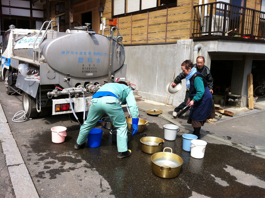 神戸水道局が大念寺で給水活動している様子。