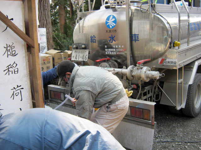 京都府の木津川市上下水道部が安渡にて給水活動している様子。
