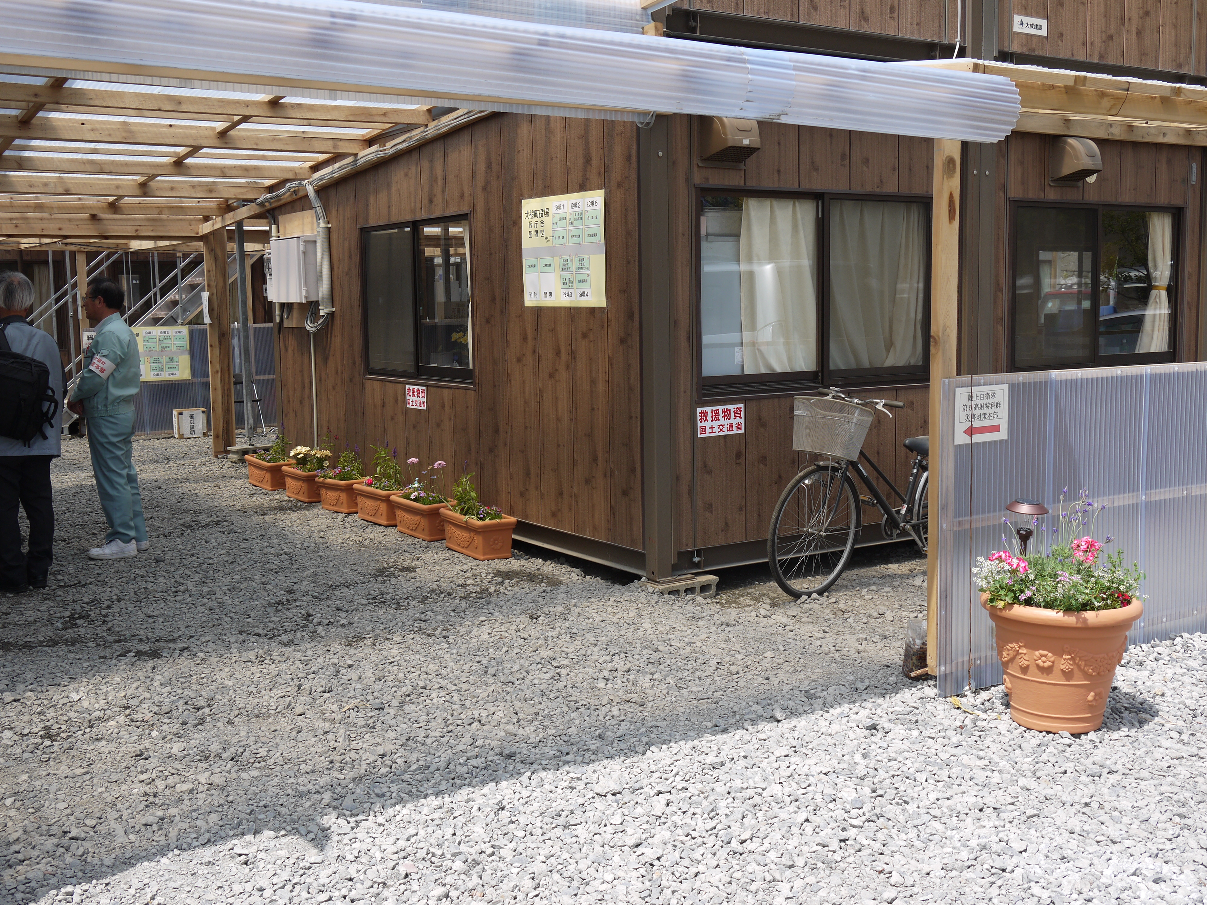 大槌小学校の校庭に移転した役場仮庁舎 拡大表示 ダウンロード 識別子 : 910 タイトルよみ : オオツチショウガッコウノコウテイニイテンシタヤクバカリチョウシャ 說明・要約 : 大槌小学校の校庭に移転した役場仮庁舎に寄贈された花 作成者(撮影者) : 大槌町 作成者(撮影者)よみ : オオツチチョウ 提供者 : 提供者よみ : 撮影(作成)場所 : 岩手県上閉伊郡大槌町 大槌町役場 撮影(作成)場所よみ : イワテケンカミヘイグンオオツチチョウ オオツチチョウヤクバ 作成日・撮影日 : 2011年 5月 27日 カテゴリー : その他 地域 : 町方地区 備考 : 震災事象 行政の執行 > 災害対策本部の組織対応 > 【仮庁舎移転】大槌町学校の校庭に仮庁舎移転