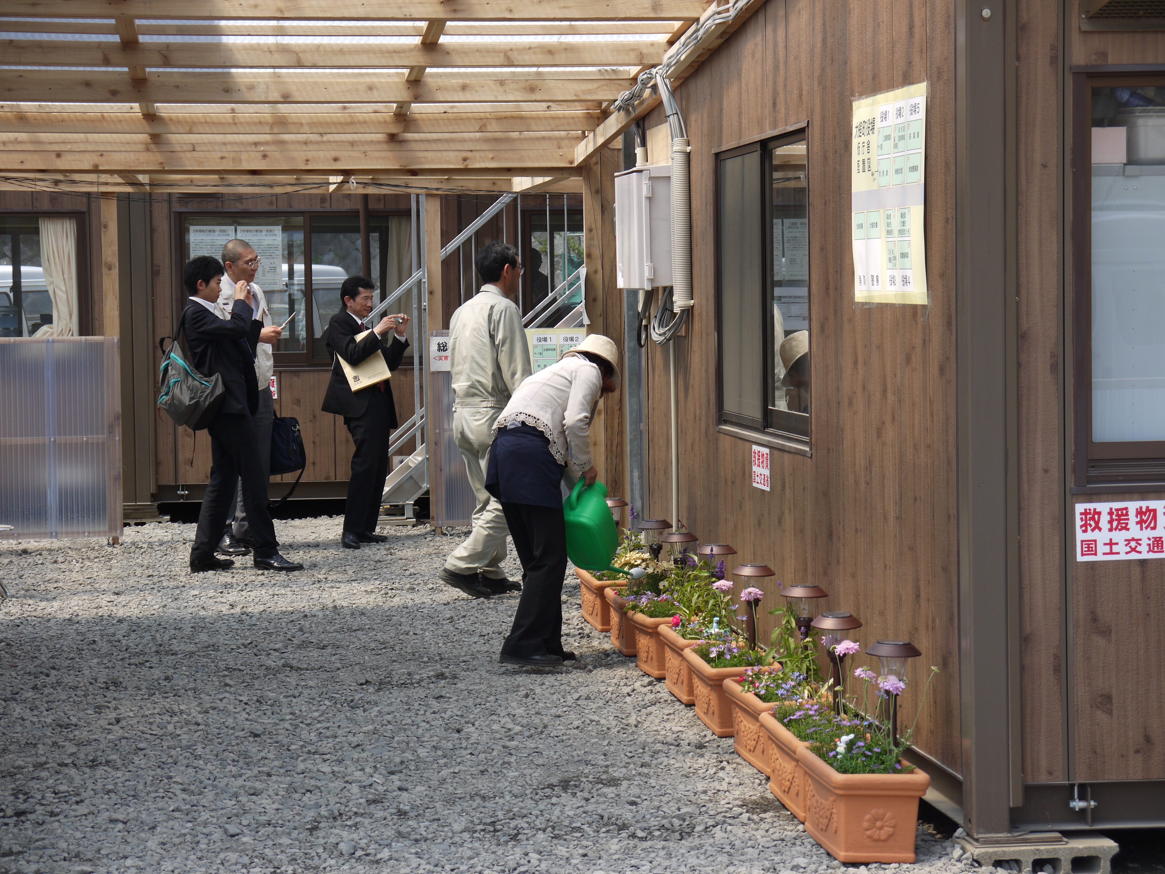 大槌小学校の校庭に移転した役場仮庁舎 拡大表示 ダウンロード 識別子 : 913 タイトルよみ : オオツチショウガッコウノコウテイニイテンシタヤクバカリチョウシャ 說明・要約 : 大槌小学校の校庭に移転した役場仮庁舎に寄贈された花 作成者(撮影者) : 大槌町 作成者(撮影者)よみ : オオツチチョウ 提供者 : 提供者よみ : 撮影(作成)場所 : 岩手県上閉伊郡大槌町 大槌町役場 撮影(作成)場所よみ : イワテケンカミヘイグンオオツチチョウ オオツチチョウヤクバ 作成日・撮影日 : 2011年 5月 27日 カテゴリー : その他 地域 : 町方地区 備考 : 震災事象 行政の執行 > 災害対策本部の組織対応 > 【仮庁舎移転】大槌町学校の校庭に仮庁舎移転