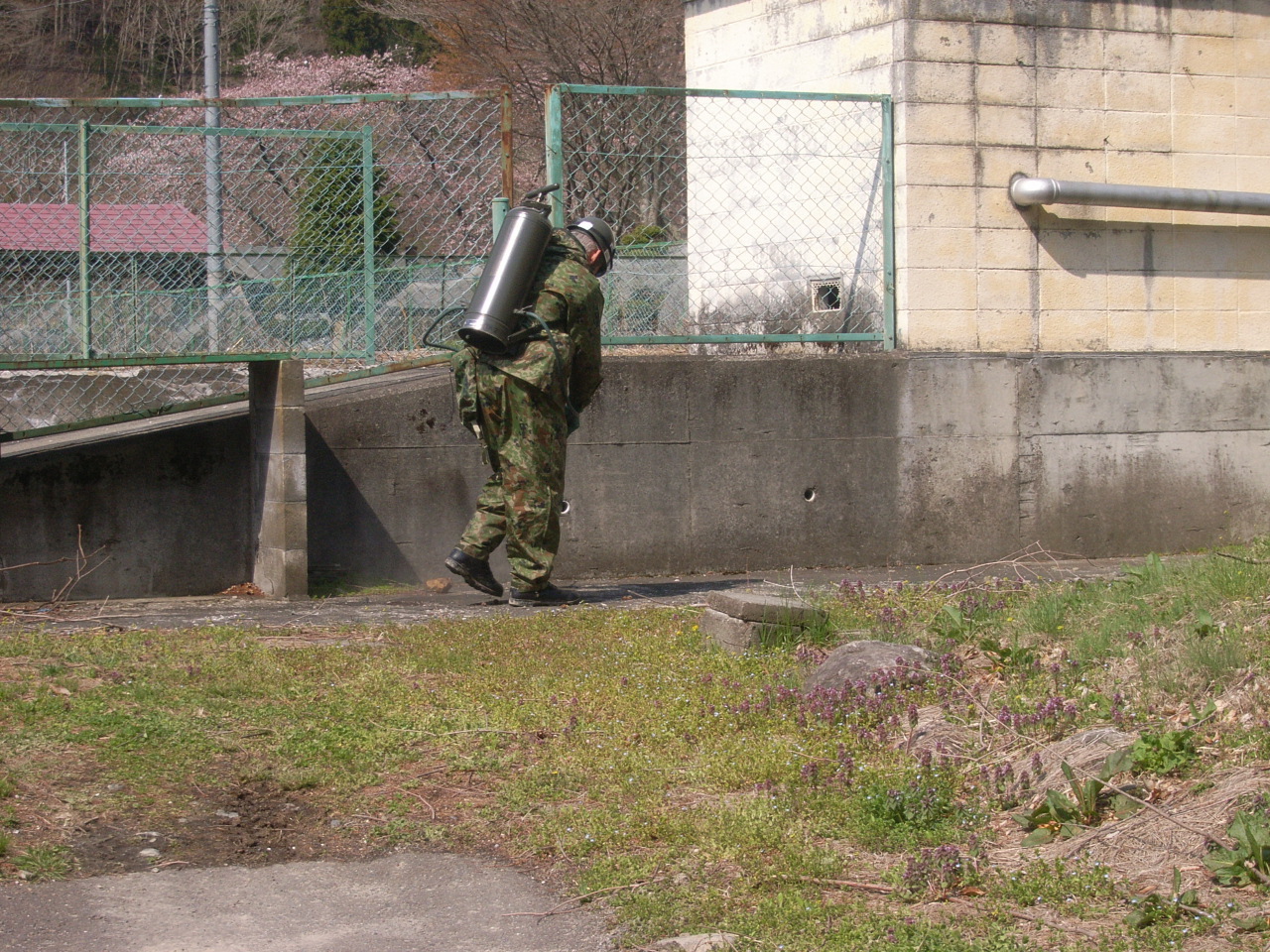 道路、建物周辺の消毒作業をしている自衛隊員