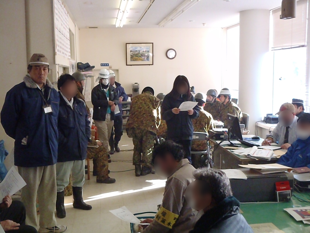 震災対策本部設置 拡大表示 ダウンロード 識別子 : 969 タイトルよみ : サイガイタイサクホンブセッチ 說明・要約 : 中央公民館に設置された災害対策本部で関係者が打合せしている様子 作成者(撮影者) : 大槌町 作成者(撮影者)よみ : オオツチチョウ 提供者 : 提供者よみ : 撮影(作成)場所 : 岩手県上閉伊郡大槌町 災害対策本部 撮影(作成)場所よみ : イワテケンカミヘイグンオオツチチョウ サイガイタイサクホンブ 作成日・撮影日 : 2011年 3月 18日 カテゴリー : 震災対応 その他 その他 地域 : 町方地区 備考 :