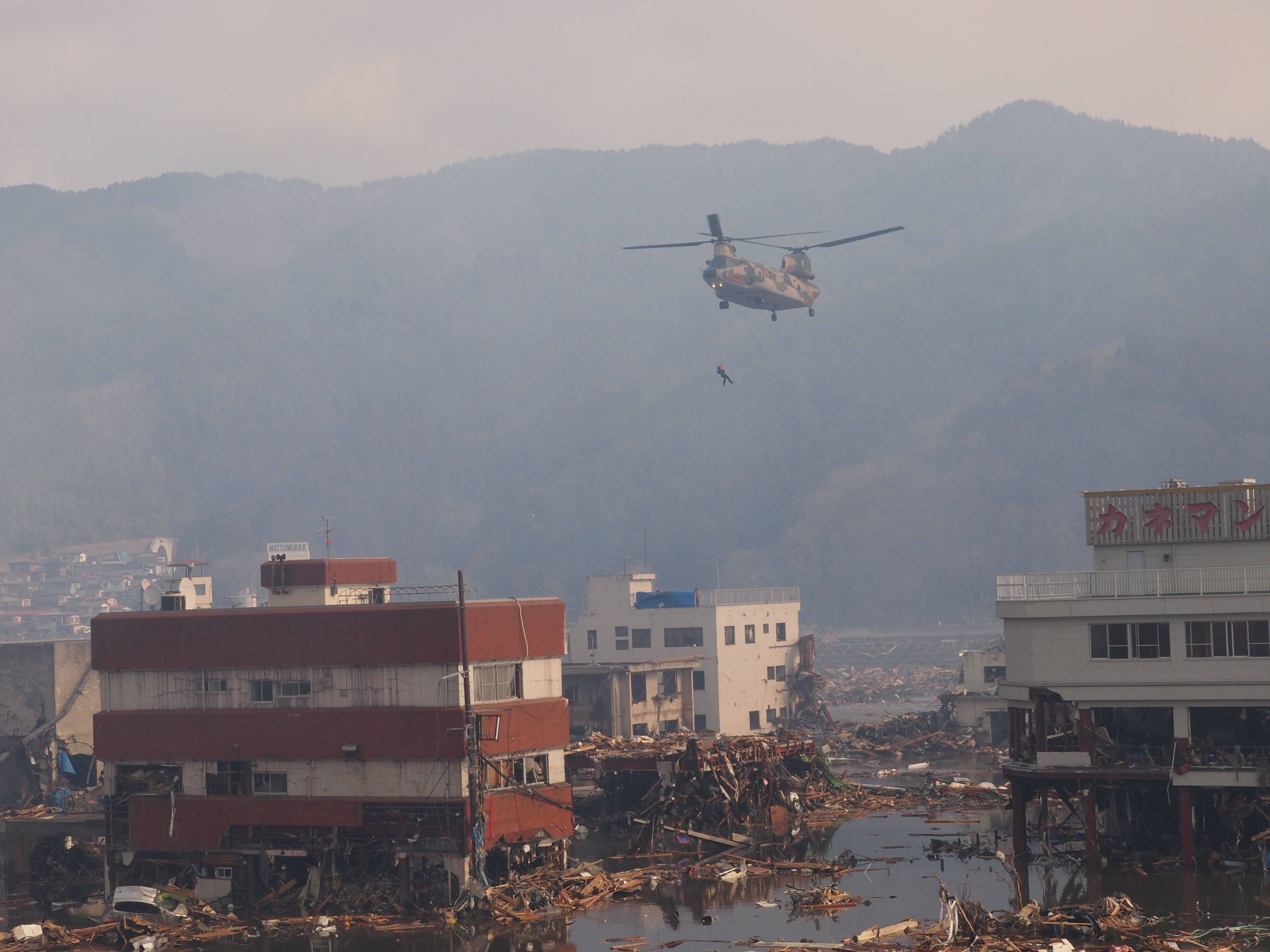 自衛隊による救出活動 拡大表示 ダウンロード 識別子 : 1136 タイトルよみ : ジエイタイニヨルキュウシュツカツドウ 說明・要約 : 自衛隊ヘリコプターによる救出活動 作成者(撮影者) : 作成者(撮影者)よみ : 提供者 : 大槌町 提供者よみ : オオツチチョウ 撮影(作成)場所 : 岩手県上閉伊郡大槌町 大町 撮影(作成)場所よみ : イワテケンカミヘイグンオオツチチョウ オオマチ 作成日・撮影日 : 2011年 3月 12日 カテゴリー : 救援活動 捜索活動 地域 : 町方地区 備考 : 震災事象 捜索・救出活動 > 自衛隊と外部応援部隊との協力による救出活動 > 【自衛隊調査屋上から救出】自衛隊の大型ヘリコプターで、庁舎屋上とおよび周辺の避難者を寺野の運動場に搬送。