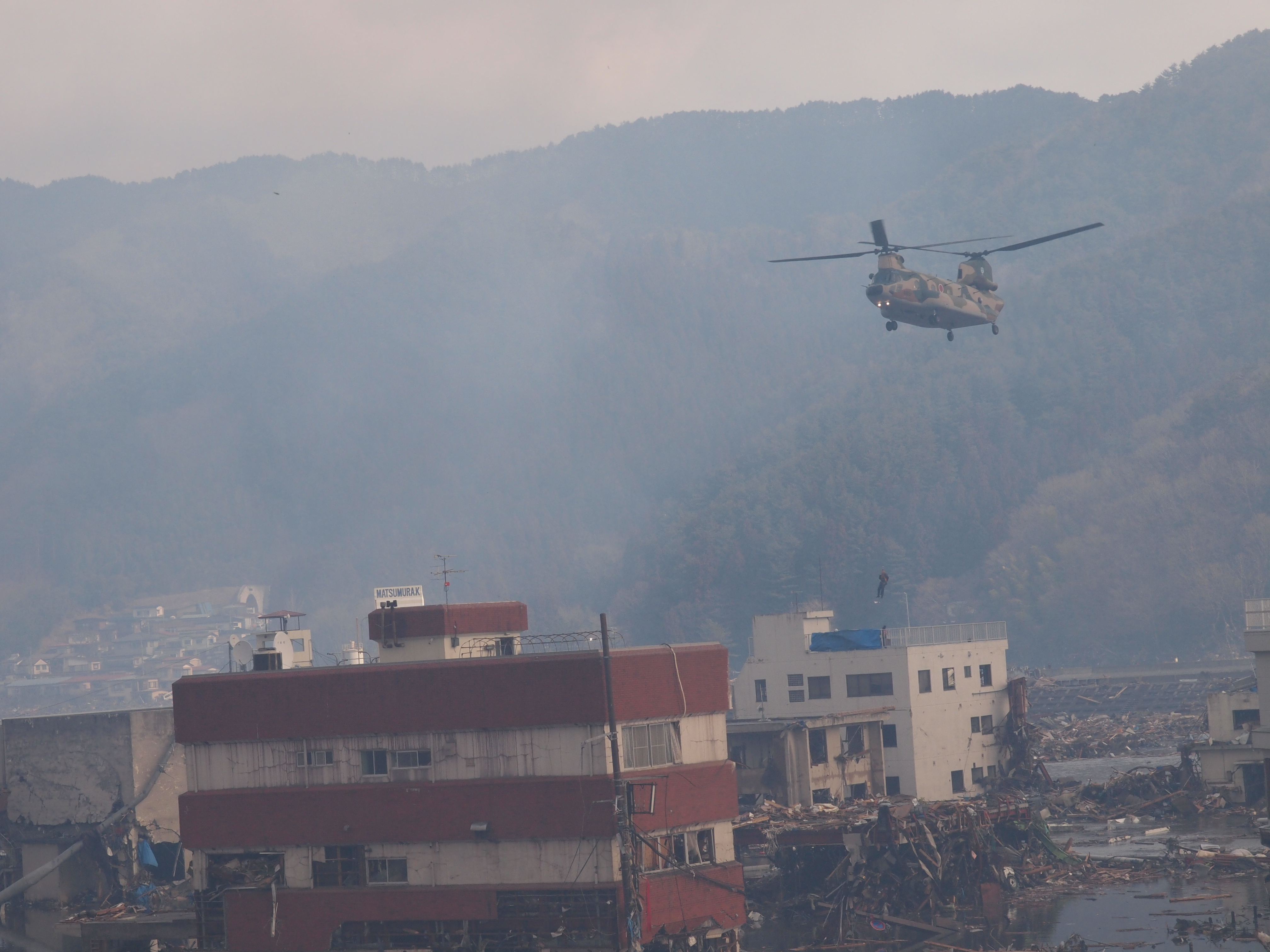 自衛隊による救出活動 拡大表示 ダウンロード 識別子 : 1140 タイトルよみ : ジエイタイニヨルキュウシュツカツドウ 說明・要約 : 自衛隊ヘリコプターによる救出活動 作成者(撮影者) : 作成者(撮影者)よみ : 提供者 : 大槌町 提供者よみ : オオツチチョウ 撮影(作成)場所 : 岩手県上閉伊郡大槌町 大町 撮影(作成)場所よみ : イワテケンカミヘイグンオオツチチョウ オオマチ 作成日・撮影日 : 2011年 3月 12日 カテゴリー : 救援活動 捜索活動 地域 : 町方地区 備考 : 震災事象 捜索・救出活動 > 自衛隊と外部応援部隊との協力による救出活動 > 【自衛隊調査屋上から救出】自衛隊の大型ヘリコプターで、庁舎屋上とおよび周辺の避難者を寺野の運動場に搬送。