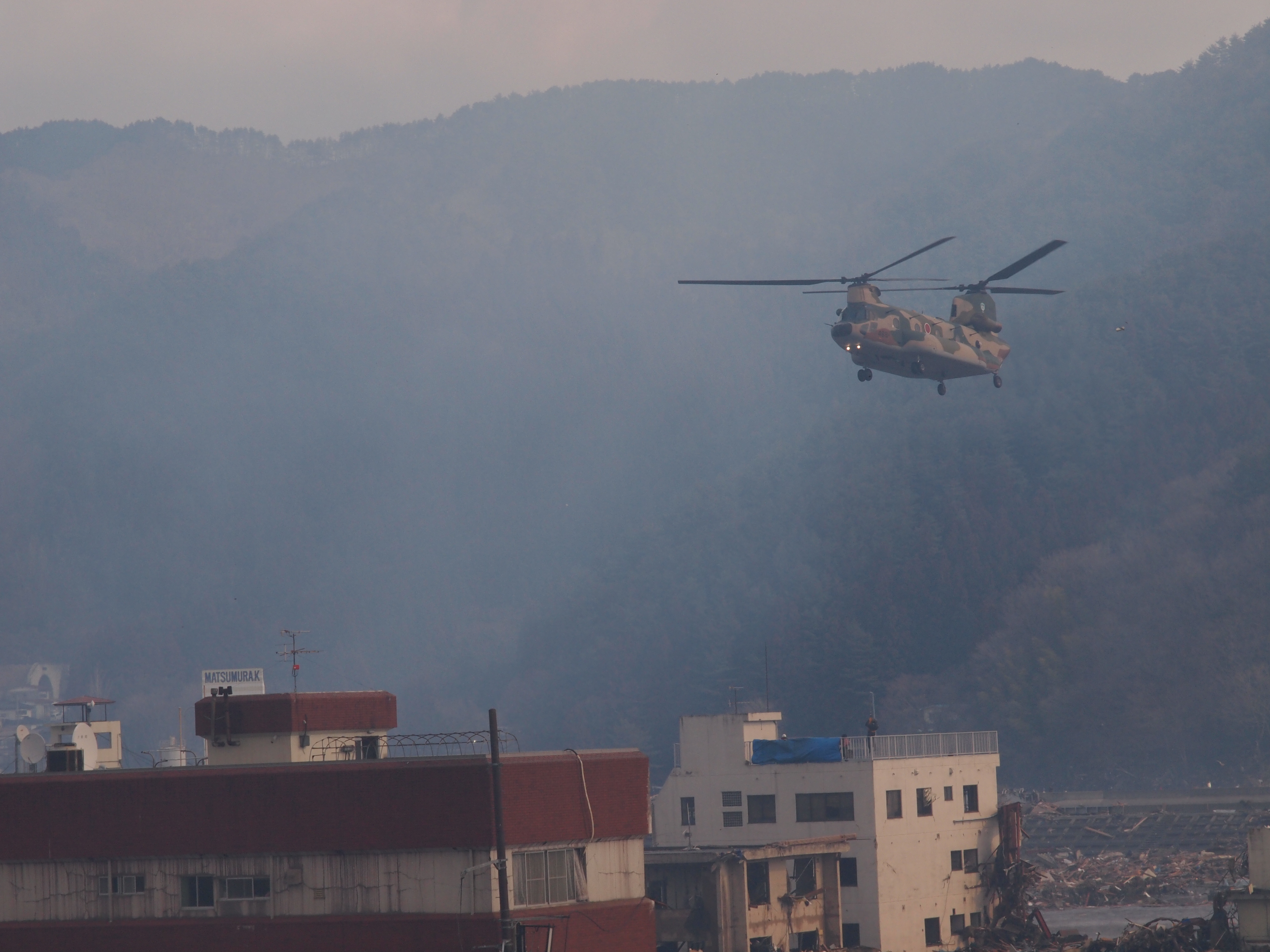 自衛隊による救出活動 拡大表示 ダウンロード 識別子 : 1141 タイトルよみ : ジエイタイニヨルキュウシュツカツドウ 說明・要約 : 自衛隊ヘリコプターによる救出活動 作成者(撮影者) : 作成者(撮影者)よみ : 提供者 : 大槌町 提供者よみ : オオツチチョウ 撮影(作成)場所 : 岩手県上閉伊郡大槌町 大町 撮影(作成)場所よみ : イワテケンカミヘイグンオオツチチョウ オオマチ 作成日・撮影日 : 2011年 3月 12日 カテゴリー : 救援活動 捜索活動 地域 : 町方地区 備考 : 震災事象 捜索・救出活動 > 自衛隊と外部応援部隊との協力による救出活動 > 【自衛隊調査屋上から救出】自衛隊の大型ヘリコプターで、庁舎屋上とおよび周辺の避難者を寺野の運動場に搬送。