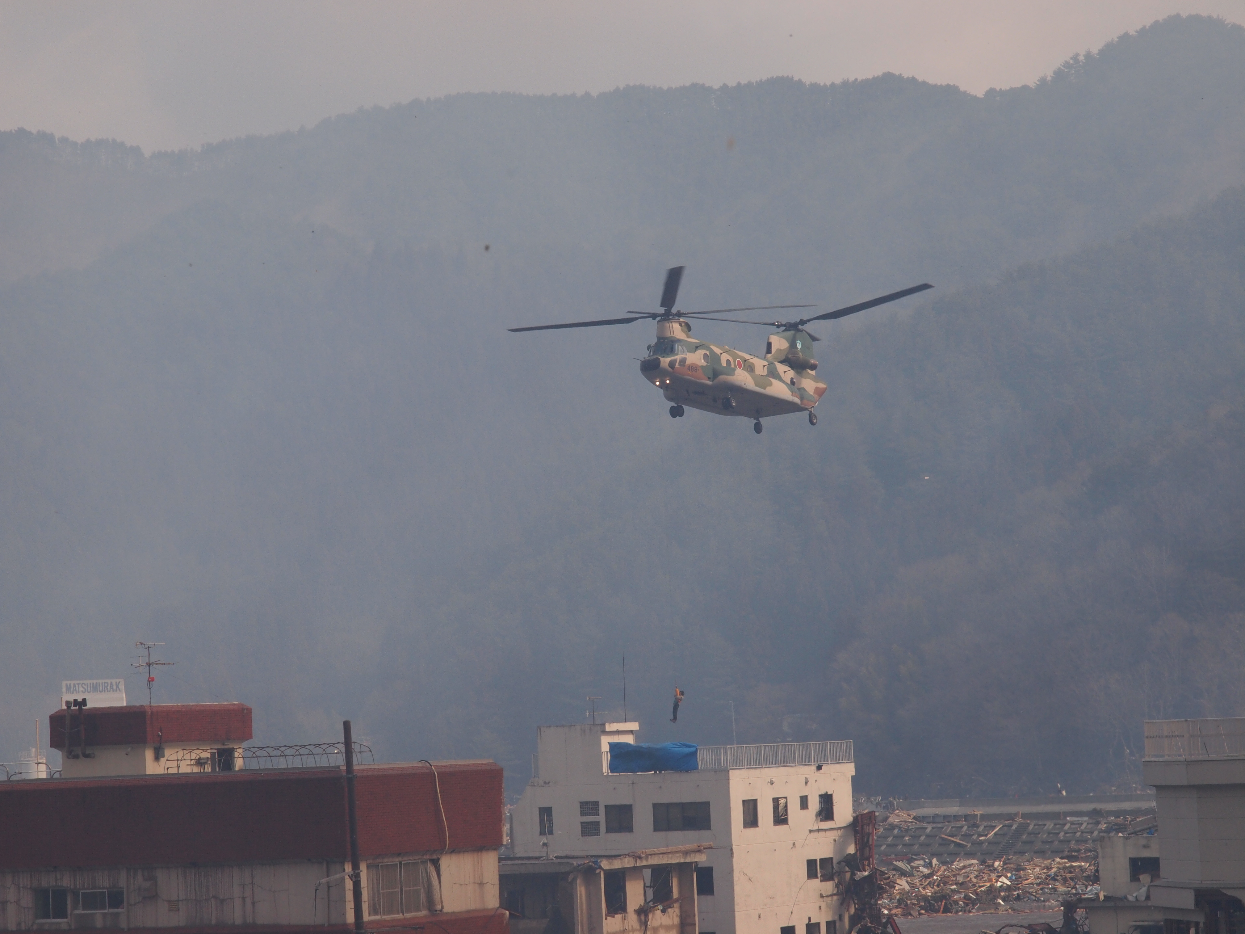 自衛隊による救出活動 拡大表示 ダウンロード 識別子 : 1143 タイトルよみ : ジエイタイニヨルキュウシュツカツドウ 說明・要約 : 自衛隊ヘリコプターによる救出活動 作成者(撮影者) : 作成者(撮影者)よみ : 提供者 : 大槌町 提供者よみ : オオツチチョウ 撮影(作成)場所 : 岩手県上閉伊郡大槌町 大町 撮影(作成)場所よみ : イワテケンカミヘイグンオオツチチョウ オオマチ 作成日・撮影日 : 2011年 3月 12日 カテゴリー : 救援活動 捜索活動 地域 : 町方地区 備考 : 震災事象 捜索・救出活動 > 自衛隊と外部応援部隊との協力による救出活動 > 【自衛隊調査屋上から救出】自衛隊の大型ヘリコプターで、庁舎屋上とおよび周辺の避難者を寺野の運動場に搬送。