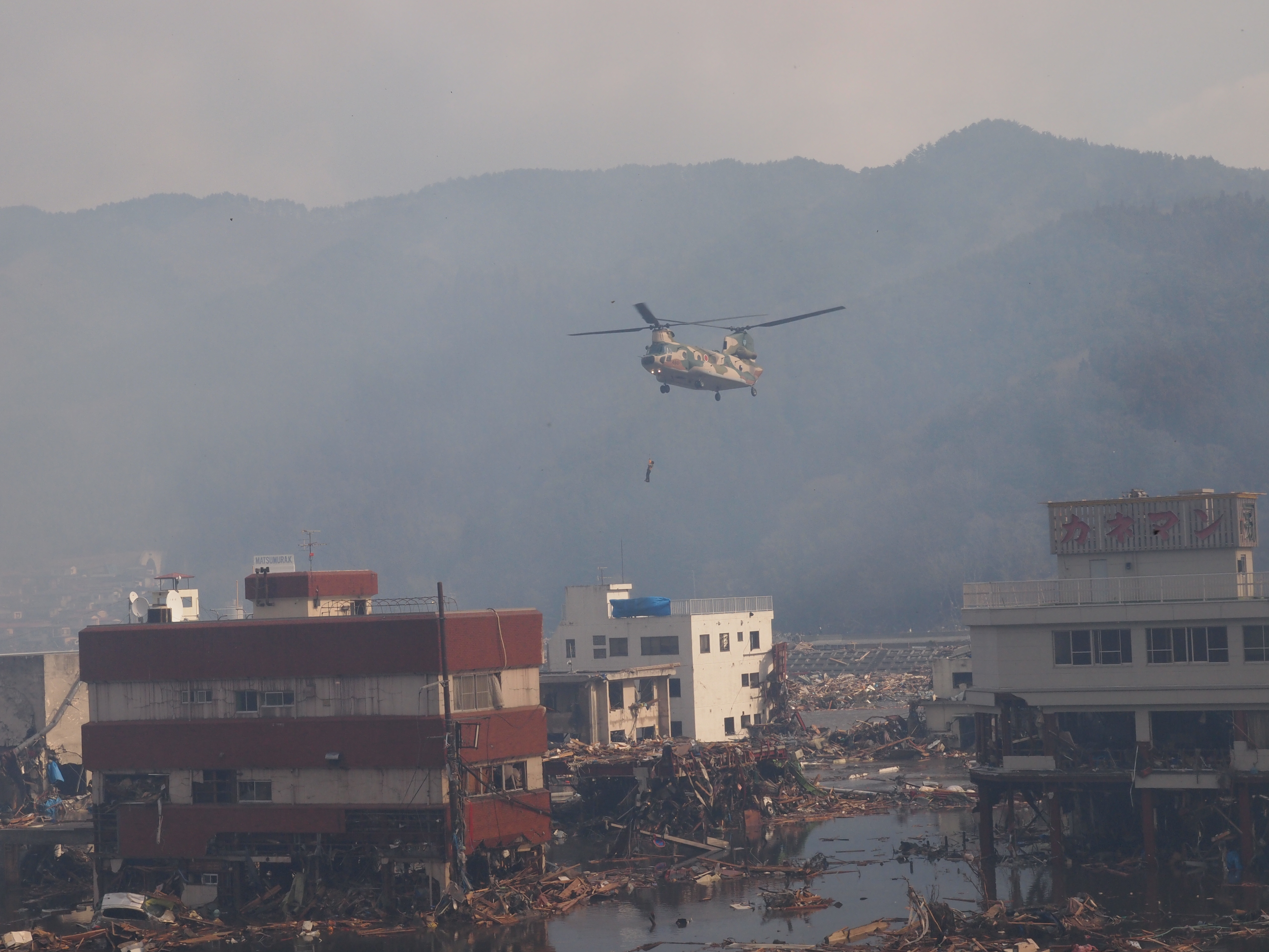自衛隊による救出活動 拡大表示 ダウンロード 識別子 : 1144 タイトルよみ : ジエイタイニヨルキュウシュツカツドウ 說明・要約 : 自衛隊ヘリコプターによる救出活動 作成者(撮影者) : 作成者(撮影者)よみ : 提供者 : 大槌町 提供者よみ : オオツチチョウ 撮影(作成)場所 : 岩手県上閉伊郡大槌町 大町 撮影(作成)場所よみ : イワテケンカミヘイグンオオツチチョウ オオマチ 作成日・撮影日 : 2011年 3月 12日 カテゴリー : 救援活動 捜索活動 地域 : 町方地区 備考 : 震災事象 捜索・救出活動 > 自衛隊と外部応援部隊との協力による救出活動 > 【自衛隊調査屋上から救出】自衛隊の大型ヘリコプターで、庁舎屋上とおよび周辺の避難者を寺野の運動場に搬送。