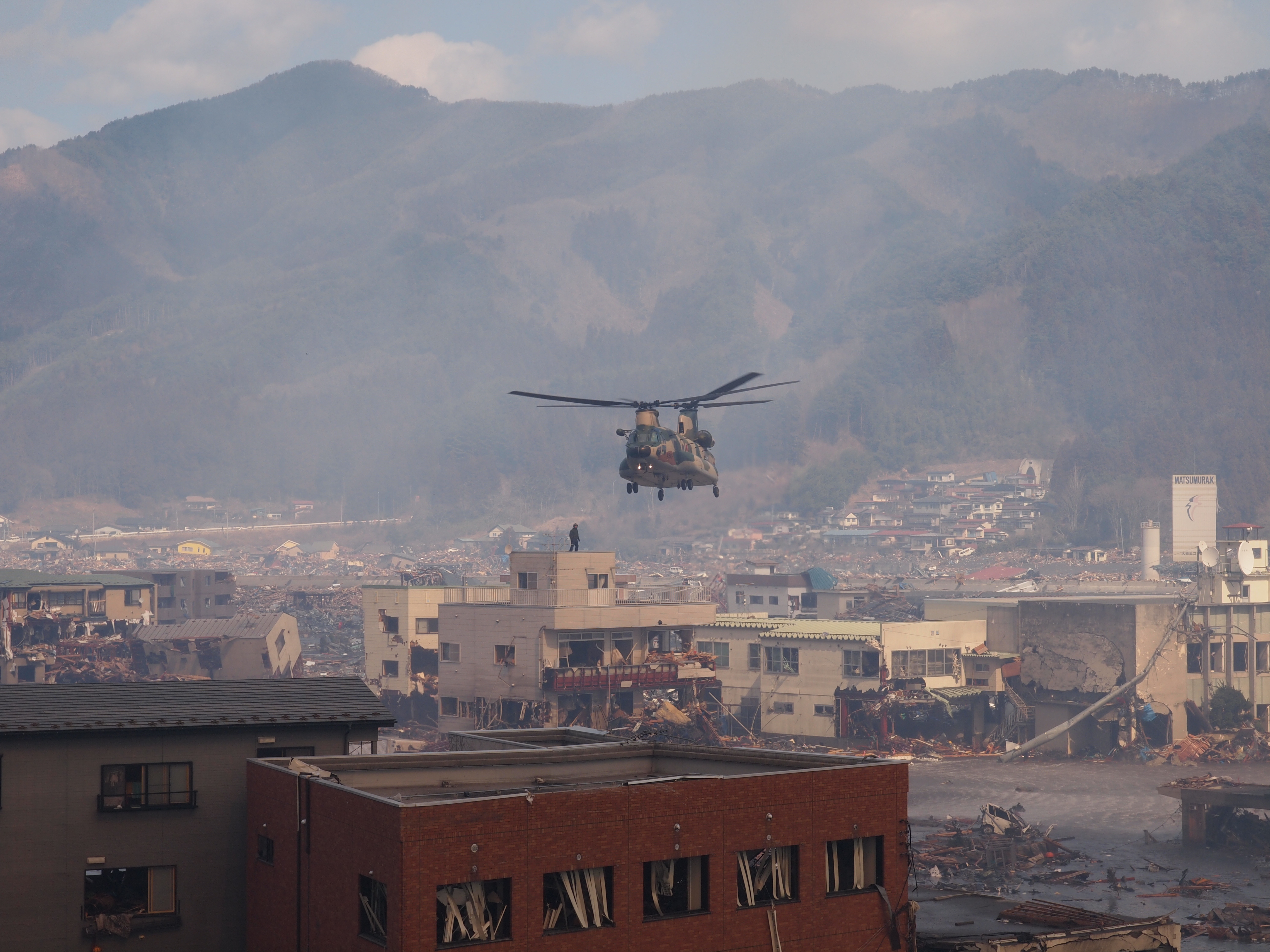 自衛隊による救出活動 拡大表示 ダウンロード 識別子 : 1165 タイトルよみ : ジエイタイニヨルキュウシュツカツドウ 說明・要約 : 自衛隊ヘリコプターによる救出活動 作成者(撮影者) : 作成者(撮影者)よみ : 提供者 : 大槌町 提供者よみ : オオツチチョウ 撮影(作成)場所 : 岩手県上閉伊郡大槌町 大町 撮影(作成)場所よみ : イワテケンカミヘイグンオオツチチョウ オオマチ 作成日・撮影日 : 2011年 3月 12日 カテゴリー : 救援活動 捜索活動 地域 : 町方地区 備考 : 震災事象 捜索・救出活動 > 自衛隊と外部応援部隊との協力による救出活動 > 【自衛隊調査屋上から救出】自衛隊の大型ヘリコプターで、庁舎屋上とおよび周辺の避難者を寺野の運動場に搬送。