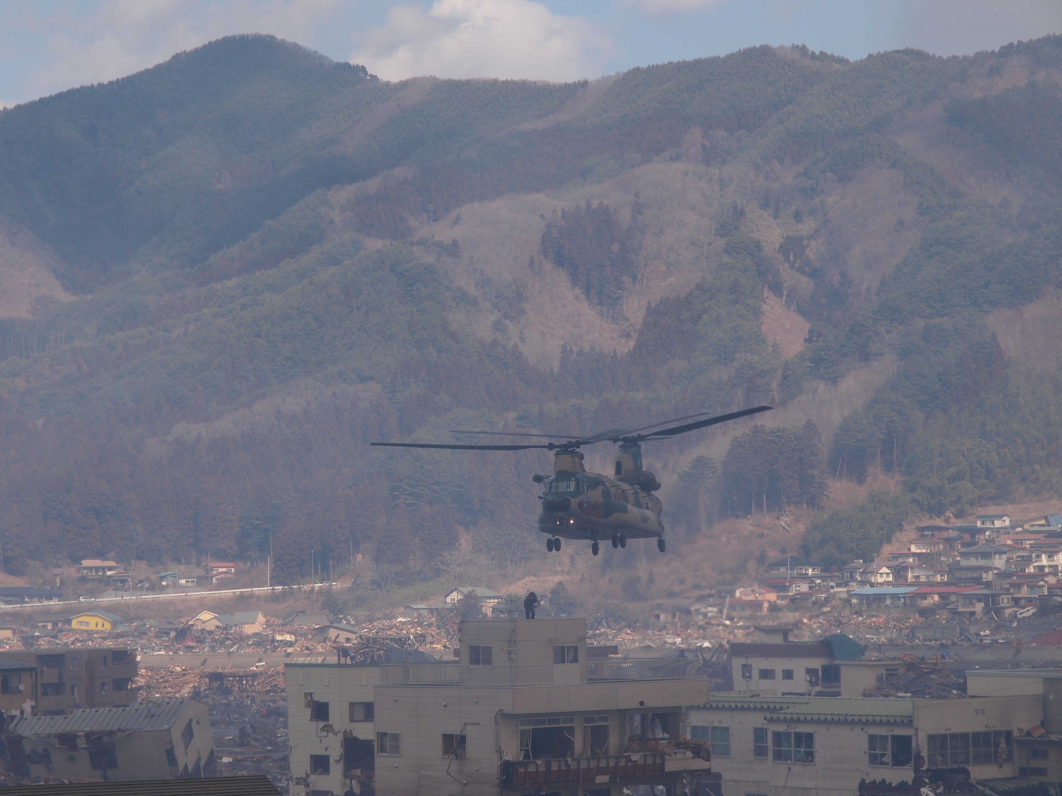 自衛隊による救出活動 拡大表示 ダウンロード 識別子 : 1169 タイトルよみ : ジエイタイニヨルキュウシュツカツドウ 說明・要約 : 自衛隊ヘリコプターによる救出活動 作成者(撮影者) : 作成者(撮影者)よみ : 提供者 : 大槌町 提供者よみ : オオツチチョウ 撮影(作成)場所 : 岩手県上閉伊郡大槌町 大町 撮影(作成)場所よみ : イワテケンカミヘイグンオオツチチョウ オオマチ 作成日・撮影日 : 2011年 3月 12日 カテゴリー : 救援活動 捜索活動 地域 : 町方地区 備考 : 震災事象 捜索・救出活動 > 自衛隊と外部応援部隊との協力による救出活動 > 【自衛隊調査屋上から救出】自衛隊の大型ヘリコプターで、庁舎屋上とおよび周辺の避難者を寺野の運動場に搬送。