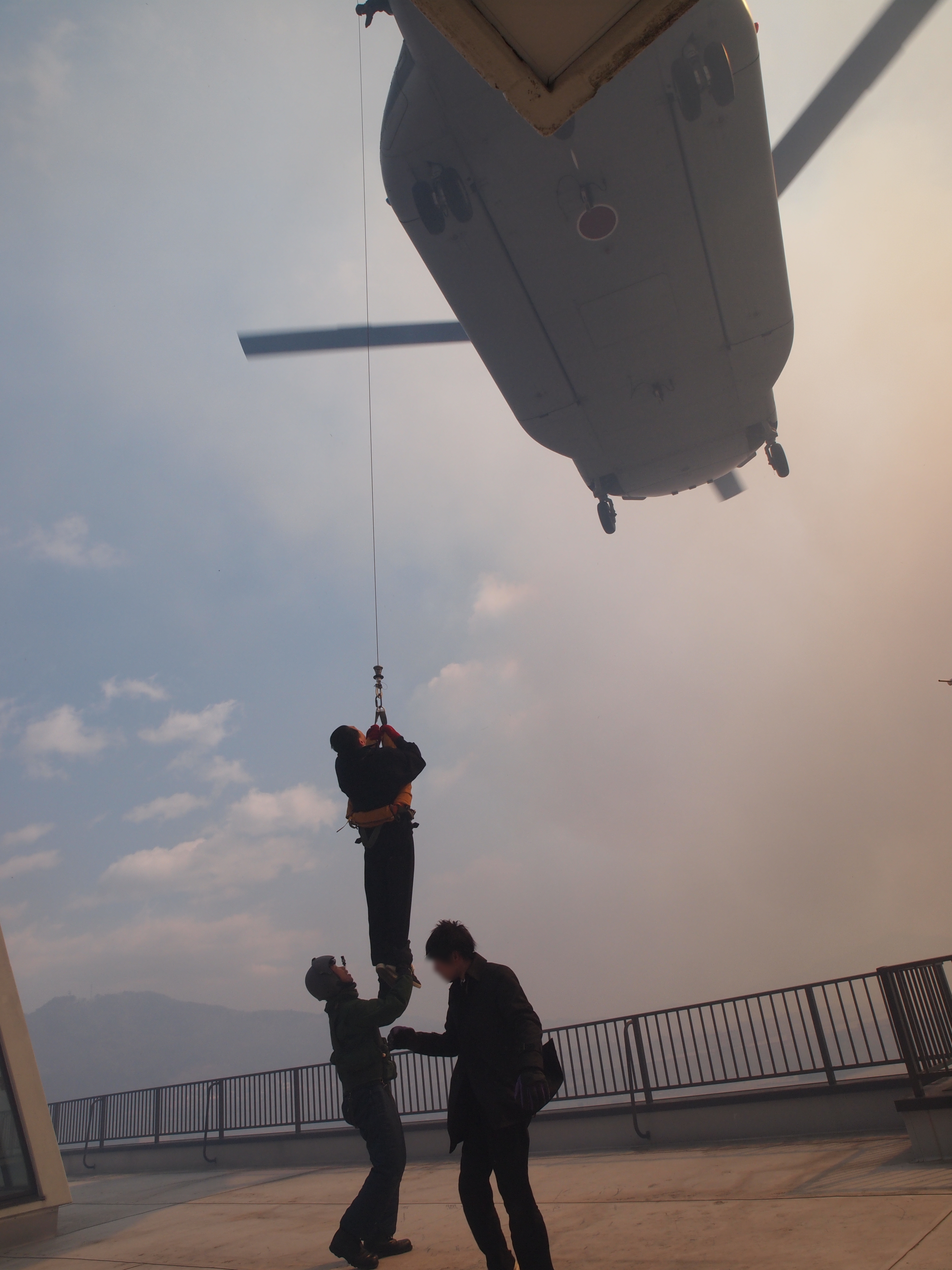 自衛隊による救出活動 拡大表示 ダウンロード 識別子 : 1217 タイトルよみ : ジエイタイニヨルキュウシュツカツドウ 說明・要約 : 救命具を体に装着し終わってヘリコプターに引き上げられる避難者の様子 作成者(撮影者) : 作成者(撮影者)よみ : 提供者 : 大槌町 提供者よみ : オオツチチョウ 撮影(作成)場所 : 岩手県上閉伊郡大槌町 大町 撮影(作成)場所よみ : イワテケンカミヘイグンオオツチチョウ オオマチ 作成日・撮影日 : 2011年 3月 12日 カテゴリー : 救援活動 捜索活動 地域 : 町方地区 備考 : 震災事象 捜索・救出活動 > 自衛隊と外部応援部隊との協力による救出活動 > 【自衛隊調査屋上から救出】自衛隊の大型ヘリコプターで、庁舎屋上とおよび周辺の避難者を寺野の運動場に搬送。