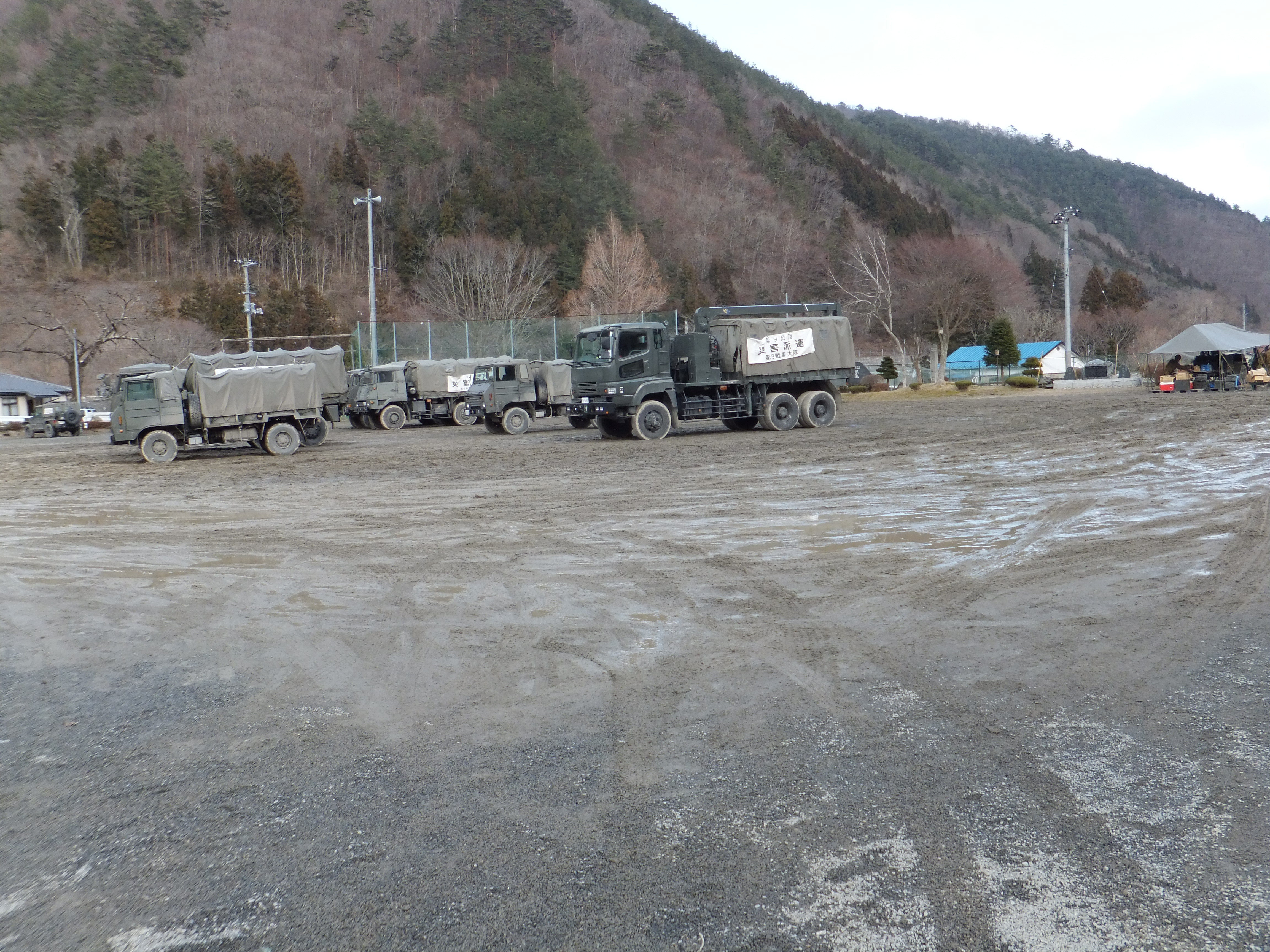 自衛隊の車が駐車している様子