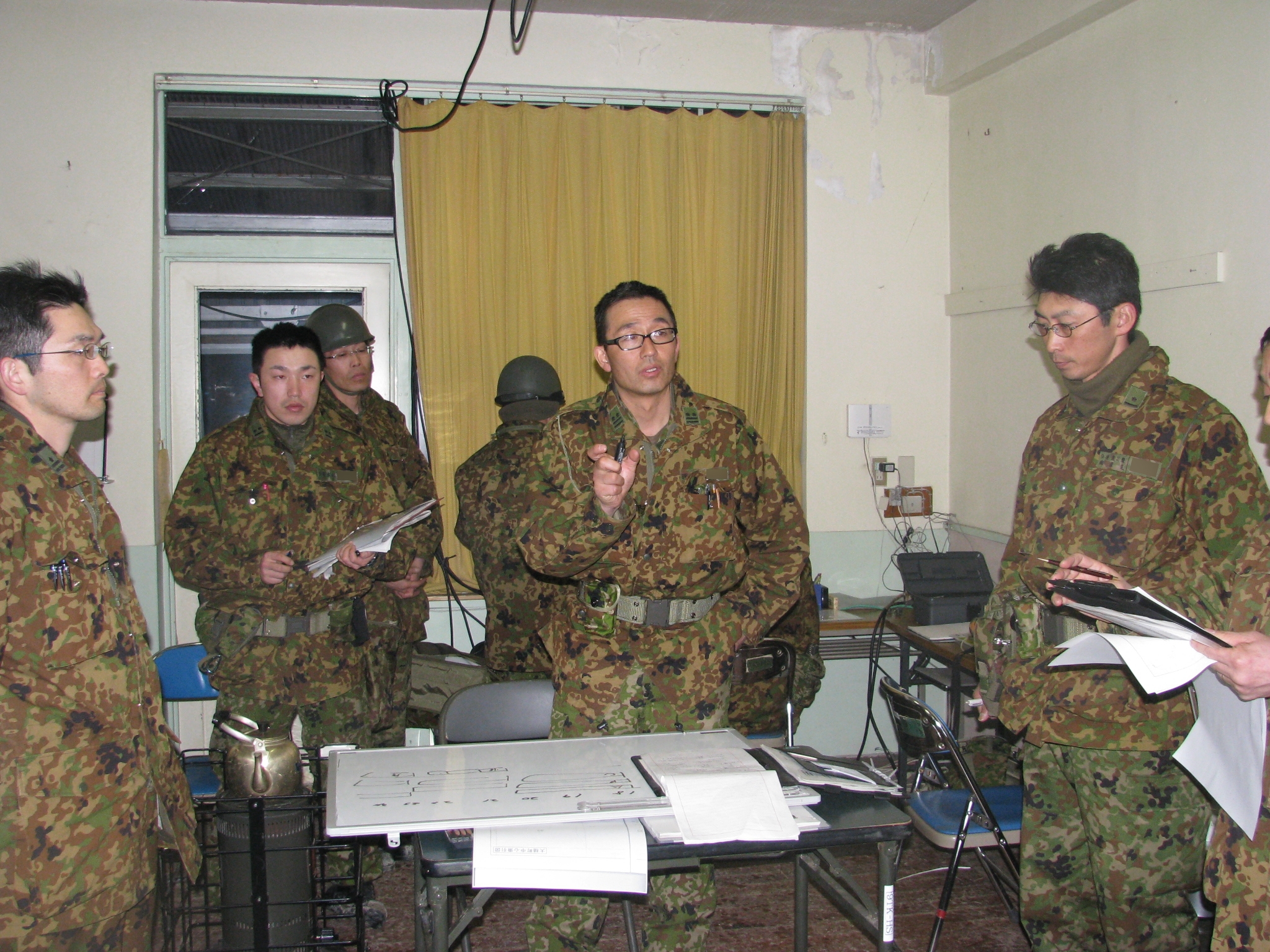 作戦会議 拡大表示 ダウンロード 識別子 : 1309 タイトルよみ : サクセンカイギ 說明・要約 : 作戦会議中の様子 作成者(撮影者) : 自衛隊 作成者(撮影者)よみ : ジエイタイ 提供者 : 自衛隊 提供者よみ : ジエイタイ 撮影(作成)場所 : 岩手県上閉伊郡大槌町 大槌町 撮影(作成)場所よみ : イワテケンカミヘイグンオオツチチョウ オオツチチョウ 作成日・撮影日 : 2011年 3月 17日 カテゴリー : 救援活動 被災者支援 地域 : その他 備考 : 関連アーカイブ 作戦会議 作戦会議 震災事象 捜索・救出活動 > 自衛隊と外部応援部隊との協力による救出活動 > 【自衛隊の拠点設置】 自衛隊がサッカー場を野営地に。