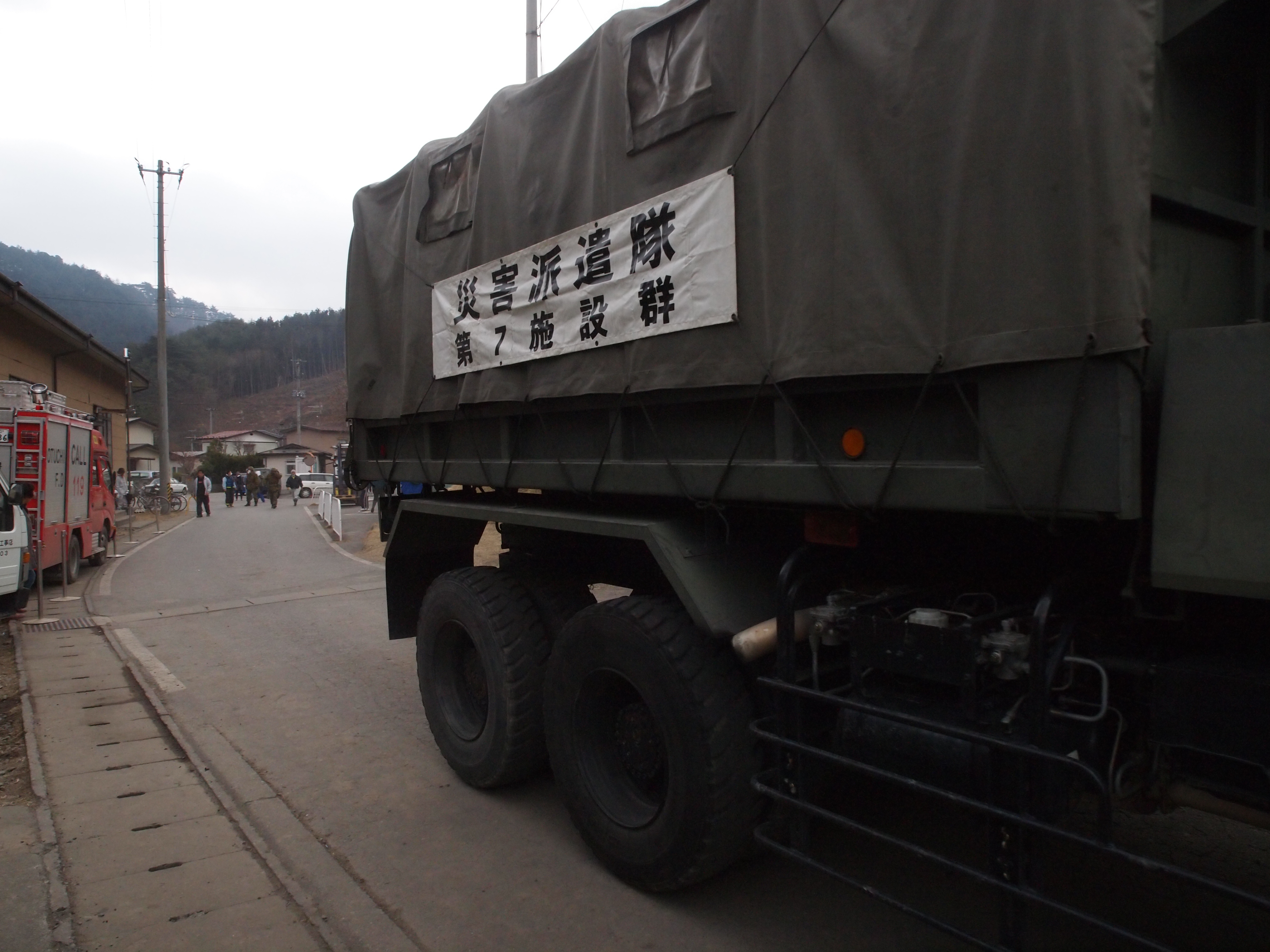 自衛隊の救援活動 拡大表示 ダウンロード 識別子 : 1311 タイトルよみ : ジエイタイノキュウエンカツドウ 說明・要約 : 寺野運動場での物資支援の様子 作成者(撮影者) : 大槌町 作成者(撮影者)よみ : オオツチチョウ 提供者 : 提供者よみ : 撮影(作成)場所 : 岩手県上閉伊郡大槌町 寺野 撮影(作成)場所よみ : イワテケンカミヘイグンオオツチチョウ テラノ 作成日・撮影日 : 2011年 3月 15日 カテゴリー : 被災者支援 地域 : 小鎚・臼澤地区 備考 : 震災事象 捜索・救出活動 > 自衛隊と外部応援部隊との協力による救出活動 > 【自衛隊の拠点設置】 自衛隊がサッカー場を野営地に。