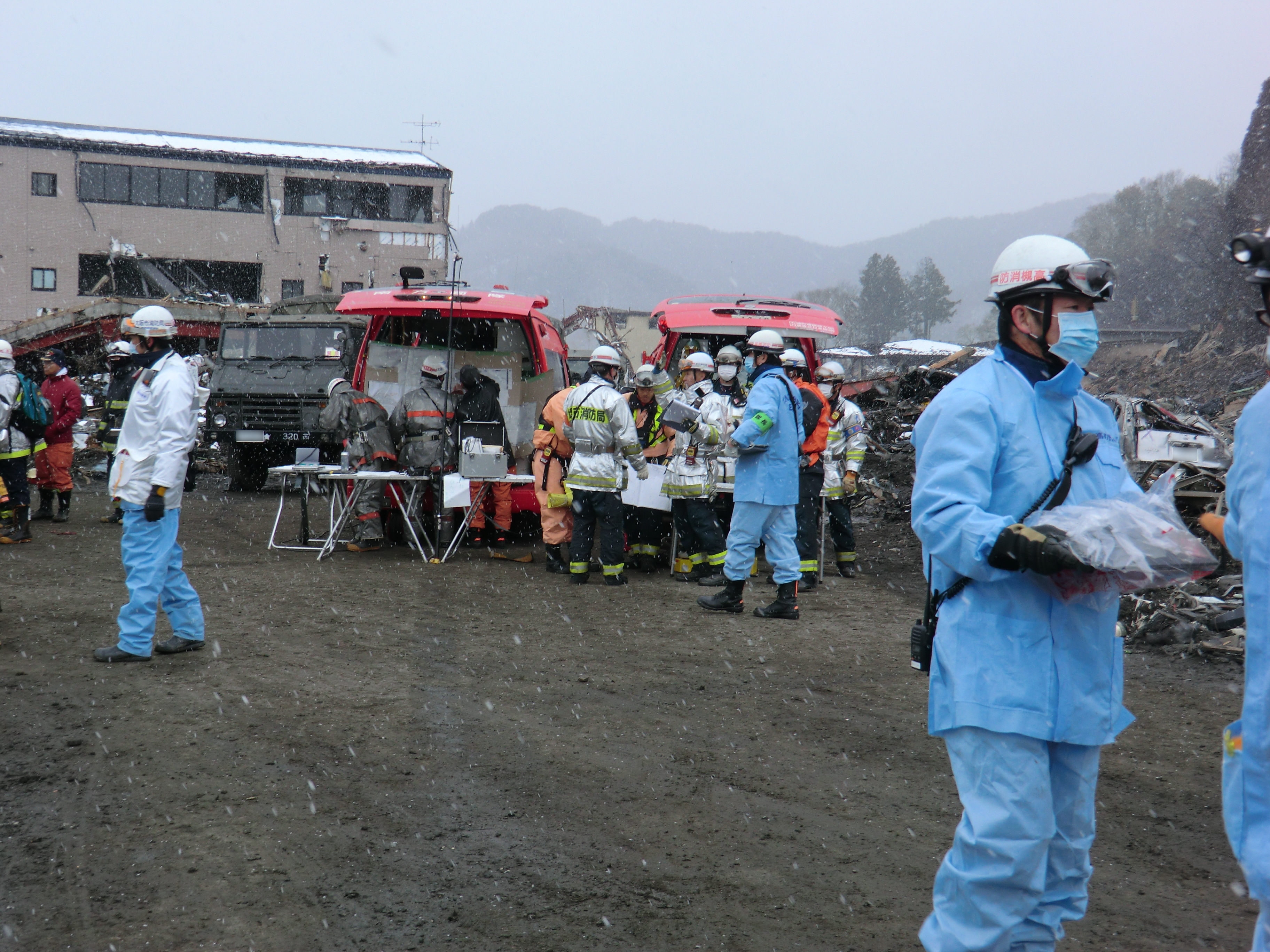 捜索活動の様子 拡大表示 ダウンロード 識別子 : 1333 タイトルよみ : ソウサクカツドウノヨウス 說明・要約 : 捜索活動をしている消防隊員と消防車両の様子 作成者(撮影者) : 堺市消防局 作成者(撮影者)よみ : サカイシショウボウキョク 提供者 : 堺市消防局 提供者よみ : サカイシショウボウキョク 撮影(作成)場所 : 岩手県上閉伊郡大槌町 大槌町 撮影(作成)場所よみ : イワテケンカミヘイグンオオツチチョウ オオツチチョウ 作成日・撮影日 : 2011年 3月 17日 カテゴリー : 捜索 地域 : その他 備考 : 堺市消防局提供 震災事象 捜索・救出活動 > 自衛隊と外部応援部隊との協力による救出活動 > 緊急消防救助隊が、救助救出活動を実施。