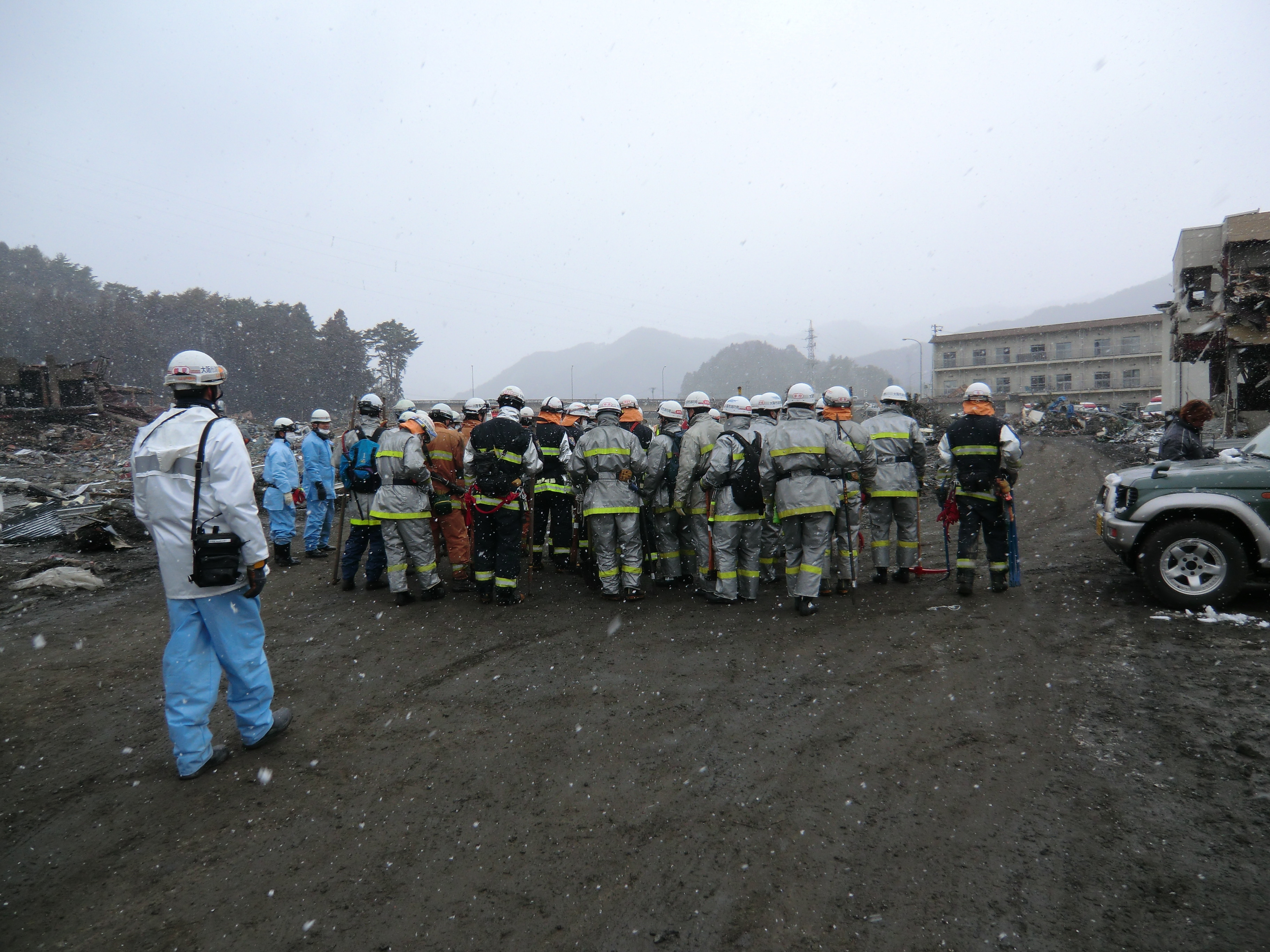 捜索活動の様子 拡大表示 ダウンロード 識別子 : 1338 タイトルよみ : ソウサクカツドウノヨウス 說明・要約 : 捜索活動をしている消防隊員が集合している様子 作成者(撮影者) : 堺市消防局 作成者(撮影者)よみ : サカイシショウボウキョク 提供者 : 堺市消防局 提供者よみ : サカイシショウボウキョク 撮影(作成)場所 : 岩手県上閉伊郡大槌町 大槌町 撮影(作成)場所よみ : イワテケンカミヘイグンオオツチチョウ オオツチチョウ 作成日・撮影日 : 2011年 3月 17日 カテゴリー : 捜索 地域 : その他 備考 : 堺市消防局提供 震災事象 捜索・救出活動 > 自衛隊と外部応援部隊との協力による救出活動 > 緊急消防救助隊が、救助救出活動を実施。