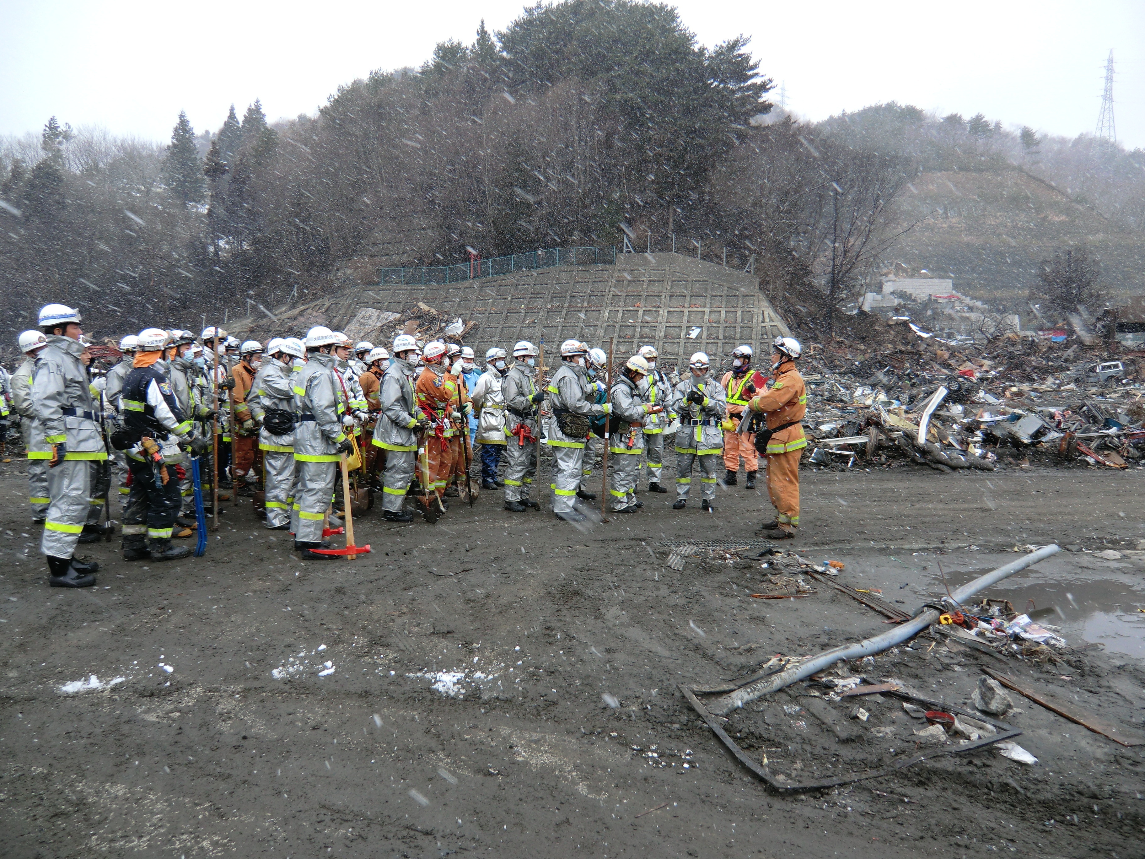 捜索活動の様子 拡大表示 ダウンロード 識別子 : 1339 タイトルよみ : ソウサクカツドウノヨウス 說明・要約 : 捜索活動をしている消防隊員が集合している様子 作成者(撮影者) : 堺市消防局 作成者(撮影者)よみ : サカイシショウボウキョク 提供者 : 堺市消防局 提供者よみ : サカイシショウボウキョク 撮影(作成)場所 : 岩手県上閉伊郡大槌町 大槌町 撮影(作成)場所よみ : イワテケンカミヘイグンオオツチチョウ オオツチチョウ 作成日・撮影日 : 2011年 3月 17日 カテゴリー : 捜索 地域 : その他 備考 : 堺市消防局提供 震災事象 捜索・救出活動 > 自衛隊と外部応援部隊との協力による救出活動 > 緊急消防救助隊が、救助救出活動を実施。