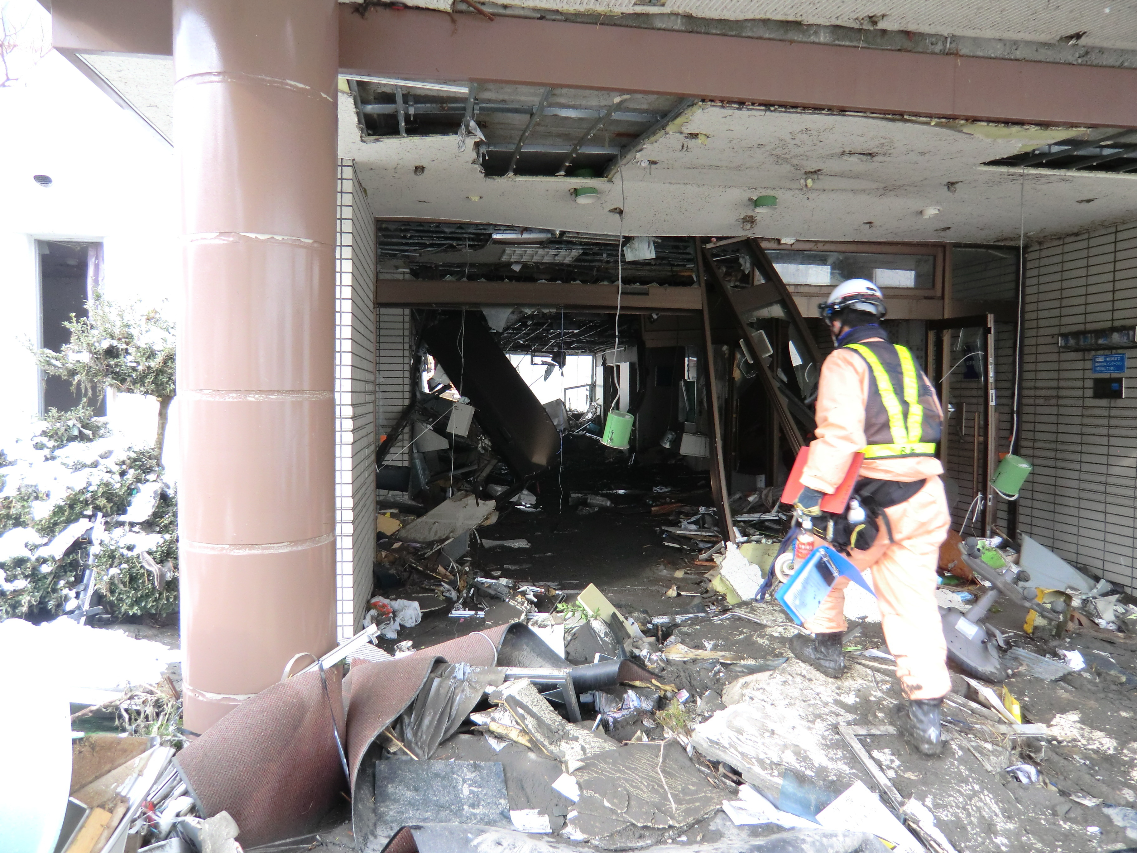 捜索活動の様子 拡大表示 ダウンロード 識別子 : 1354 タイトルよみ : ソウサクカツドウノヨウス 說明・要約 : 被災した旧大槌病院建物の中で捜索活動をしている消防隊員 作成者(撮影者) : 堺市消防局 作成者(撮影者)よみ : サカイシショウボウキョク 提供者 : 堺市消防局 提供者よみ : サカイシショウボウキョク 撮影(作成)場所 : 岩手県上閉伊郡大槌町 大槌病院 撮影(作成)場所よみ : イワテケンカミヘイグンオオツチチョウ オオツチビョウイン 作成日・撮影日 : 2011年 3月 17日 カテゴリー : 捜索 地域 : 町方地区 備考 : 堺市消防局提供 震災事象 捜索・救出活動 > 自衛隊と外部応援部隊との協力による救出活動 > 緊急消防救助隊が、救助救出活動を実施。