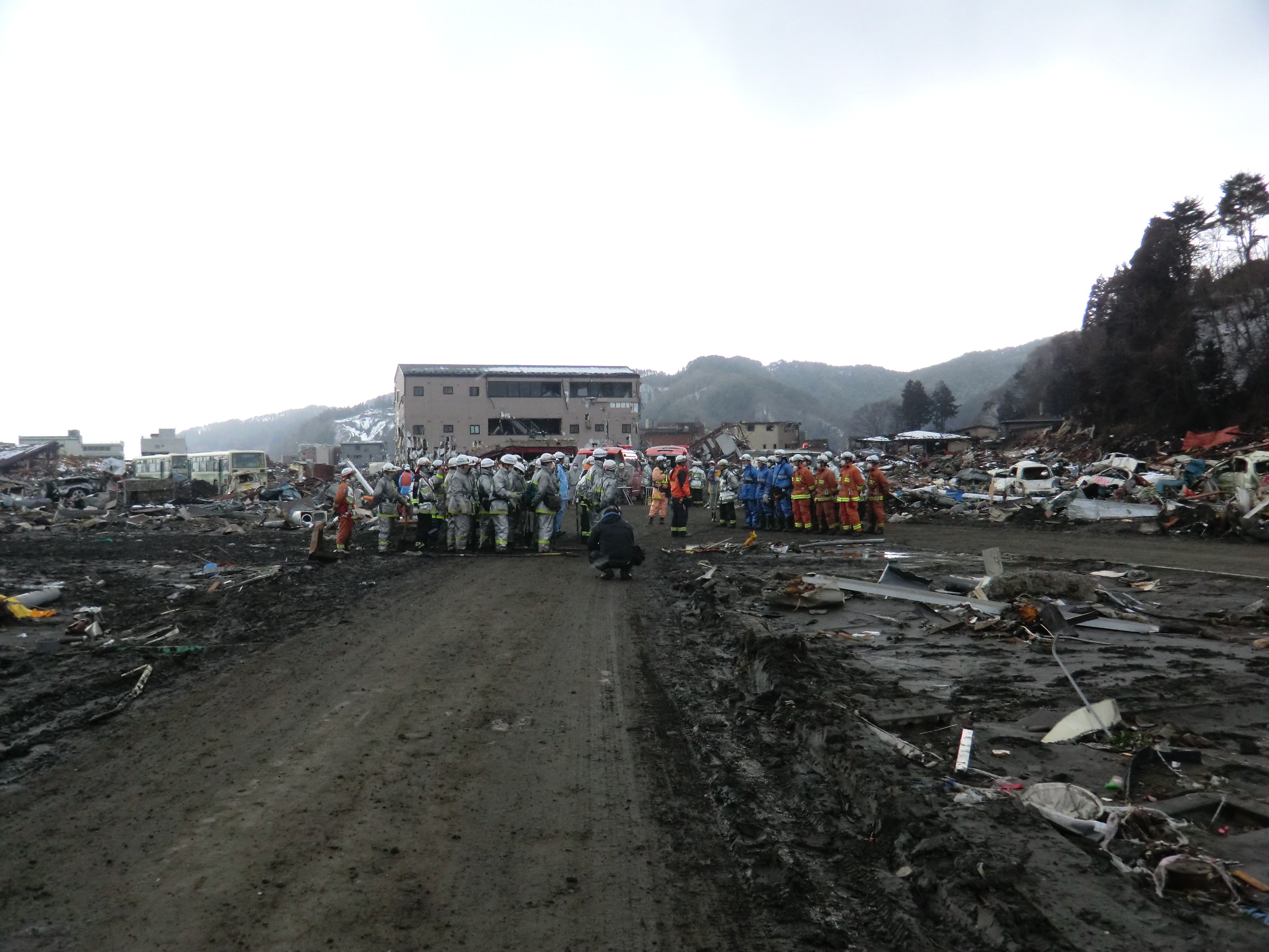 捜索活動の様子 拡大表示 ダウンロード 識別子 : 1373 タイトルよみ : ソウサクカツドウノヨウス 說明・要約 : 捜索活動をしている消防隊員が集合している様子 作成者(撮影者) : 堺市消防局 作成者(撮影者)よみ : サカイシショウボウキョク 提供者 : 堺市消防局 提供者よみ : サカイシショウボウキョク 撮影(作成)場所 : 岩手県上閉伊郡大槌町 末広町 撮影(作成)場所よみ : イワテケンカミヘイグンオオツチチョウ スエヒロチョウ 作成日・撮影日 : 2011年 3月 17日 カテゴリー : 捜索 地域 : 町方地区 備考 : 堺市消防局提供 震災事象 捜索・救出活動 > 自衛隊と外部応援部隊との協力による救出活動 > 緊急消防救助隊が、救助救出活動を実施。