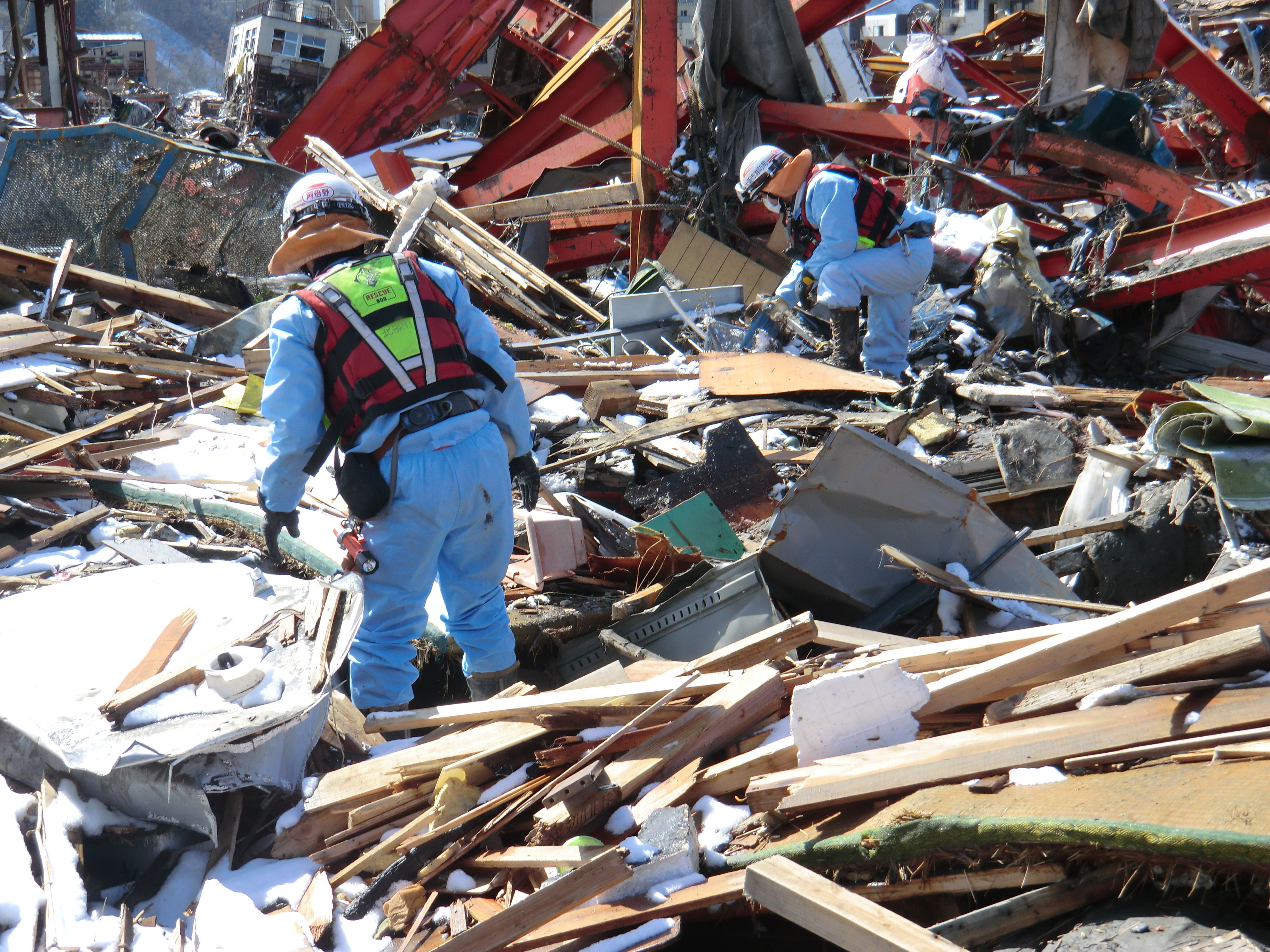捜索活動の様子 拡大表示 ダウンロード 識別子 : 1419 タイトルよみ : ソウサクカツドウノヨウス 說明・要約 : 散乱しているガレキの中で捜索活動をしている消防隊員の様子 作成者(撮影者) : 堺市消防局 作成者(撮影者)よみ : サカイシショウボウキョク 提供者 : 堺市消防局 提供者よみ : サカイシショウボウキョク 撮影(作成)場所 : 岩手県上閉伊郡大槌町 撮影(作成)場所よみ : イワテケンカミヘイグンオオツチチョウ 作成日・撮影日 : 2011年 3月 18日 カテゴリー : 捜索 地域 : 町方地区 備考 : 堺市消防局提供 震災事象 捜索・救出活動 > 遺体捜索 救護 > 緊急消防救助隊でローラー作戦を実施。全国緊急消防隊の活動終了。
