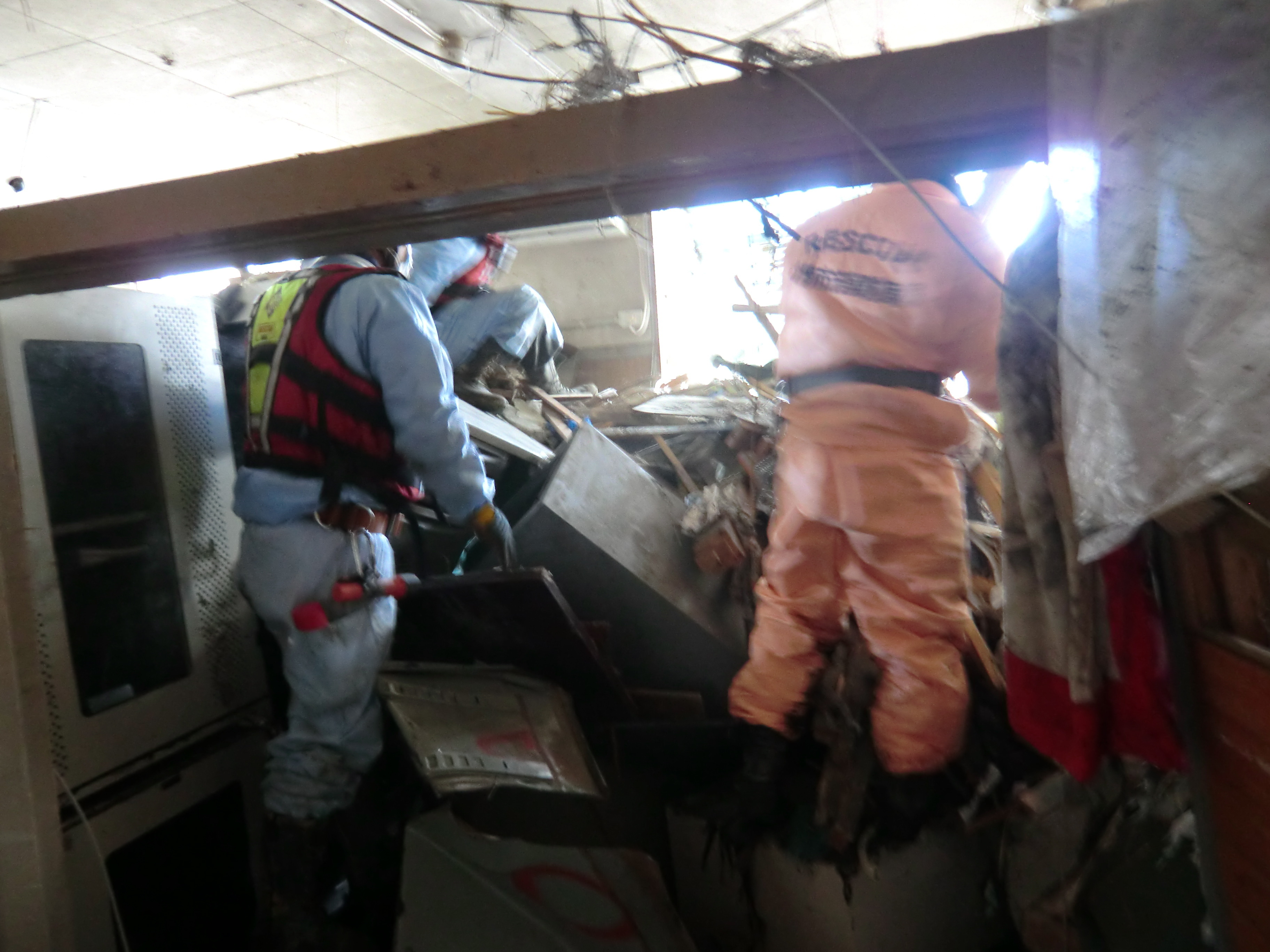 捜索活動の様子 拡大表示 ダウンロード 識別子 : 1462 タイトルよみ : ソウサクカツドウノヨウス 說明・要約 : 被災した旧大槌町役場庁舎の中で捜索活動をしている消防隊員の様子 作成者(撮影者) : 堺市消防局 作成者(撮影者)よみ : サカイシショウボウキョク 提供者 : 堺市消防局 提供者よみ : サカイシショウボウキョク 撮影(作成)場所 : 岩手県上閉伊郡大槌町 旧役場庁舎 撮影(作成)場所よみ : イワテケンカミヘイグンオオツチチョウ キュウヤクバチョウシャ 作成日・撮影日 : 2011年 3月 18日 カテゴリー : 捜索 地域 : 町方地区 備考 : 堺市消防局提供 震災事象 捜索・救出活動 > 遺体捜索 救護 > 緊急消防救助隊でローラー作戦を実施。全国緊急消防隊の活動終了。
