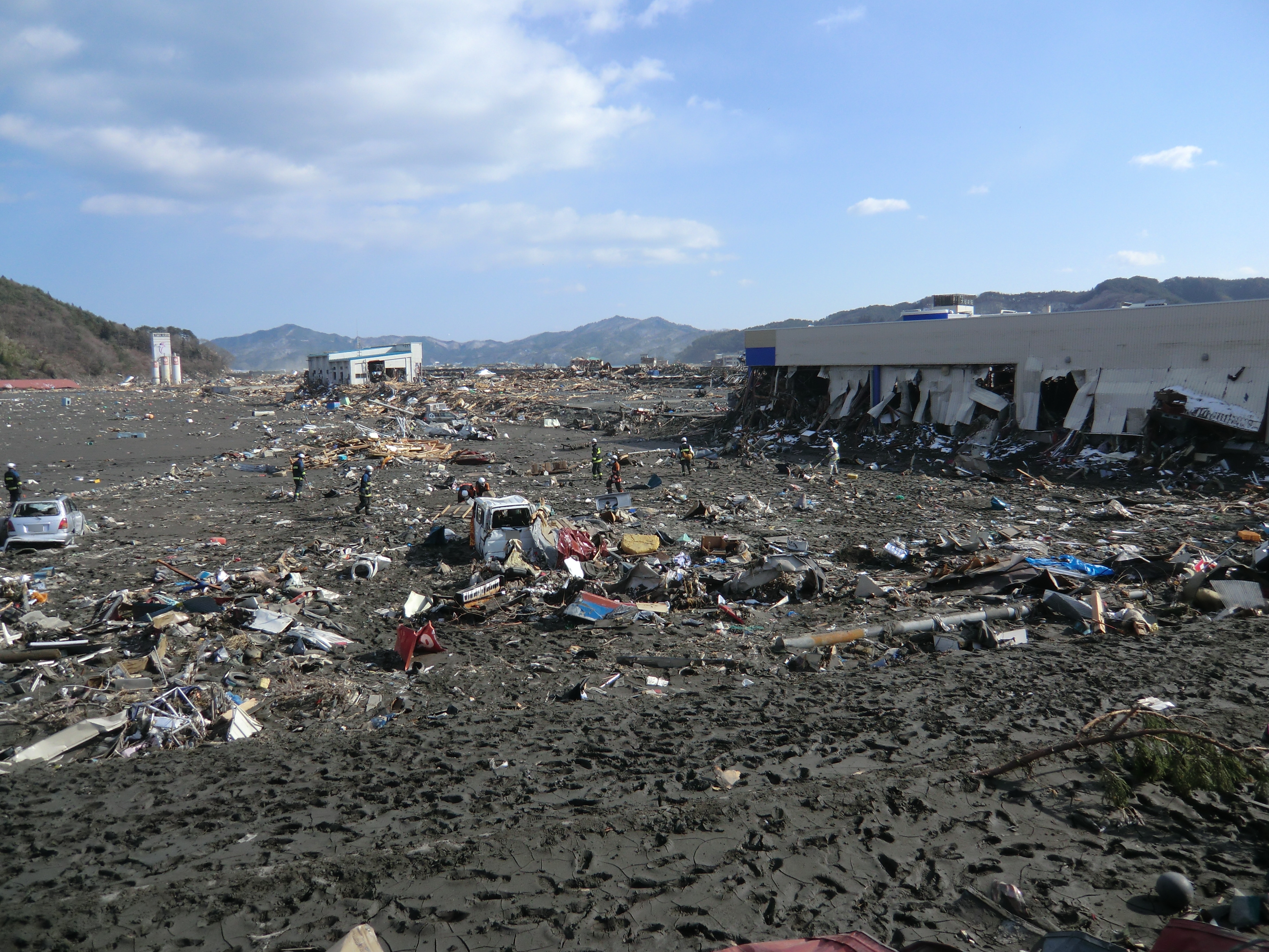 散乱しているガレキの中で捜索活動をしている消防隊員の様子