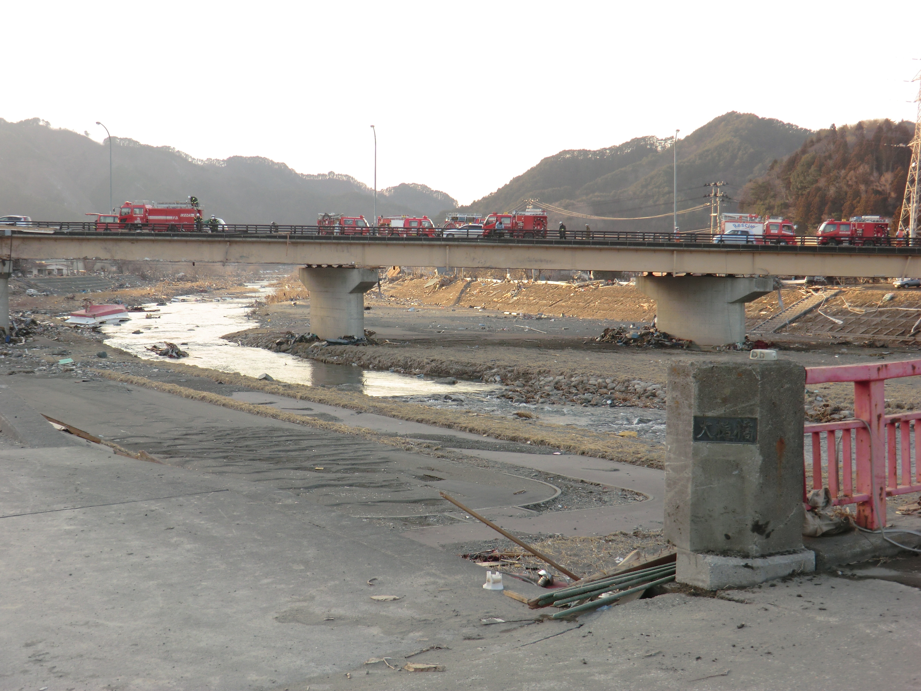 被災状況 拡大表示 ダウンロード 識別子 : 1526 タイトルよみ : ヒサイジョウキョウ 說明・要約 : 国道45号線の橋の上で駐車している消防車両の様子 作成者(撮影者) : 堺市消防局 作成者(撮影者)よみ : サカイシショウボウキョク 提供者 : 堺市消防局 提供者よみ : サカイシショウボウキョク 撮影(作成)場所 : 岩手県上閉伊郡大槌町 末広町 撮影(作成)場所よみ : イワテケンカミヘイグンオオツチチョウ スエヒロチョウ 作成日・撮影日 : 2011年 3月 18日 カテゴリー : 物的被害 捜索 地域 : 町方地区 備考 : 堺市消防局提供 震災事象 捜索・救出活動 > 遺体捜索 救護 > 緊急消防救助隊でローラー作戦を実施。全国緊急消防隊の活動終了。