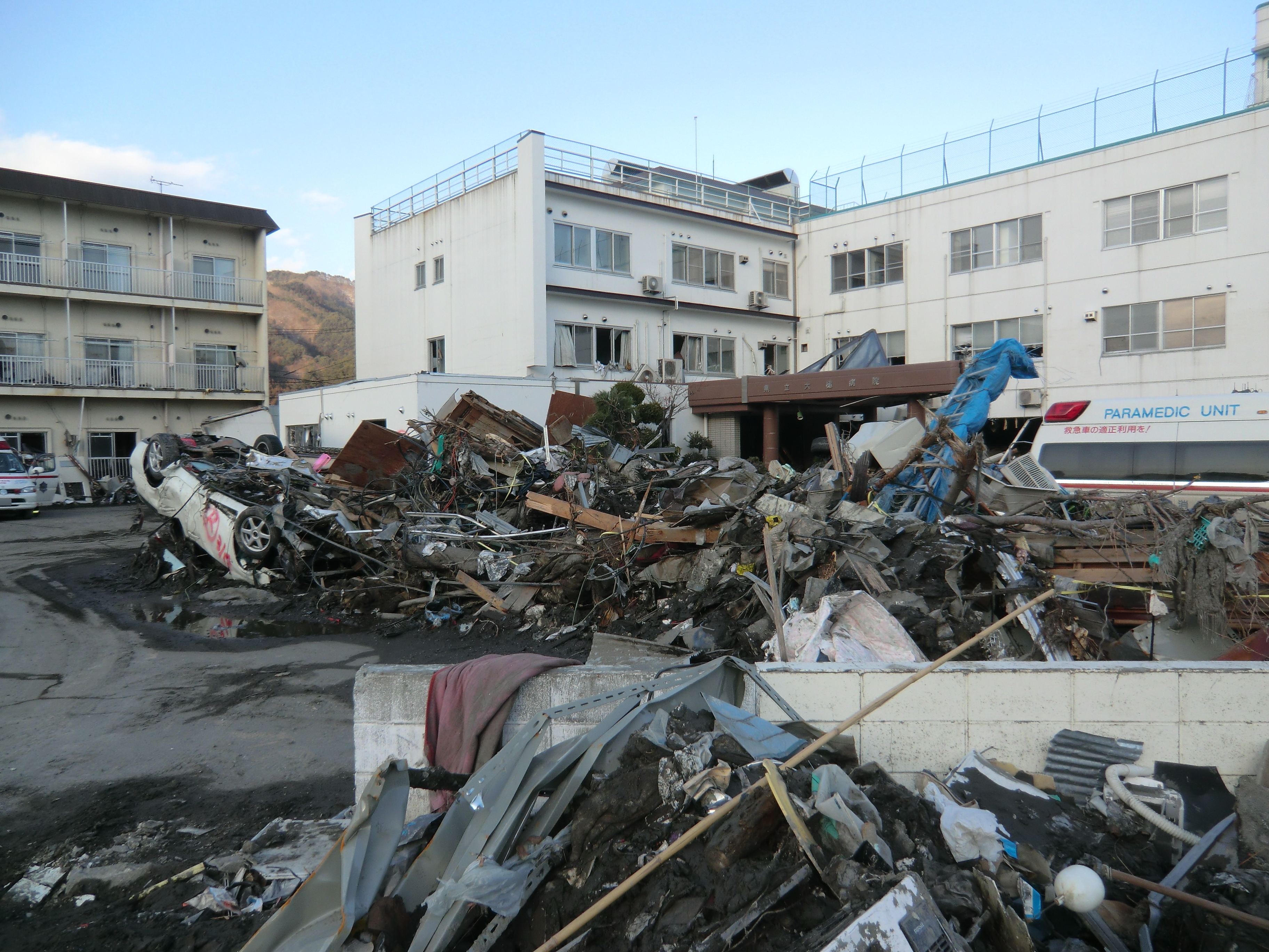 被災状況 拡大表示 ダウンロード 識別子 : 1528 タイトルよみ : ヒサイジョウキョウ 說明・要約 : 旧県立大槌病院玄関前はガレキで覆いつくされている 作成者(撮影者) : 堺市消防局 作成者(撮影者)よみ : サカイシショウボウキョク 提供者 : 堺市消防局 提供者よみ : サカイシショウボウキョク 撮影(作成)場所 : 岩手県上閉伊郡大槌町 大槌病院 撮影(作成)場所よみ : イワテケンカミヘイグンオオツチチョウ オオツチビョウイン 作成日・撮影日 : 2011年 3月 18日 カテゴリー : 物的被害 地域 : 町方地区 備考 : 堺市消防局提供 震災事象 捜索・救出活動 > 遺体捜索 救護 > 緊急消防救助隊でローラー作戦を実施。全国緊急消防隊の活動終了。