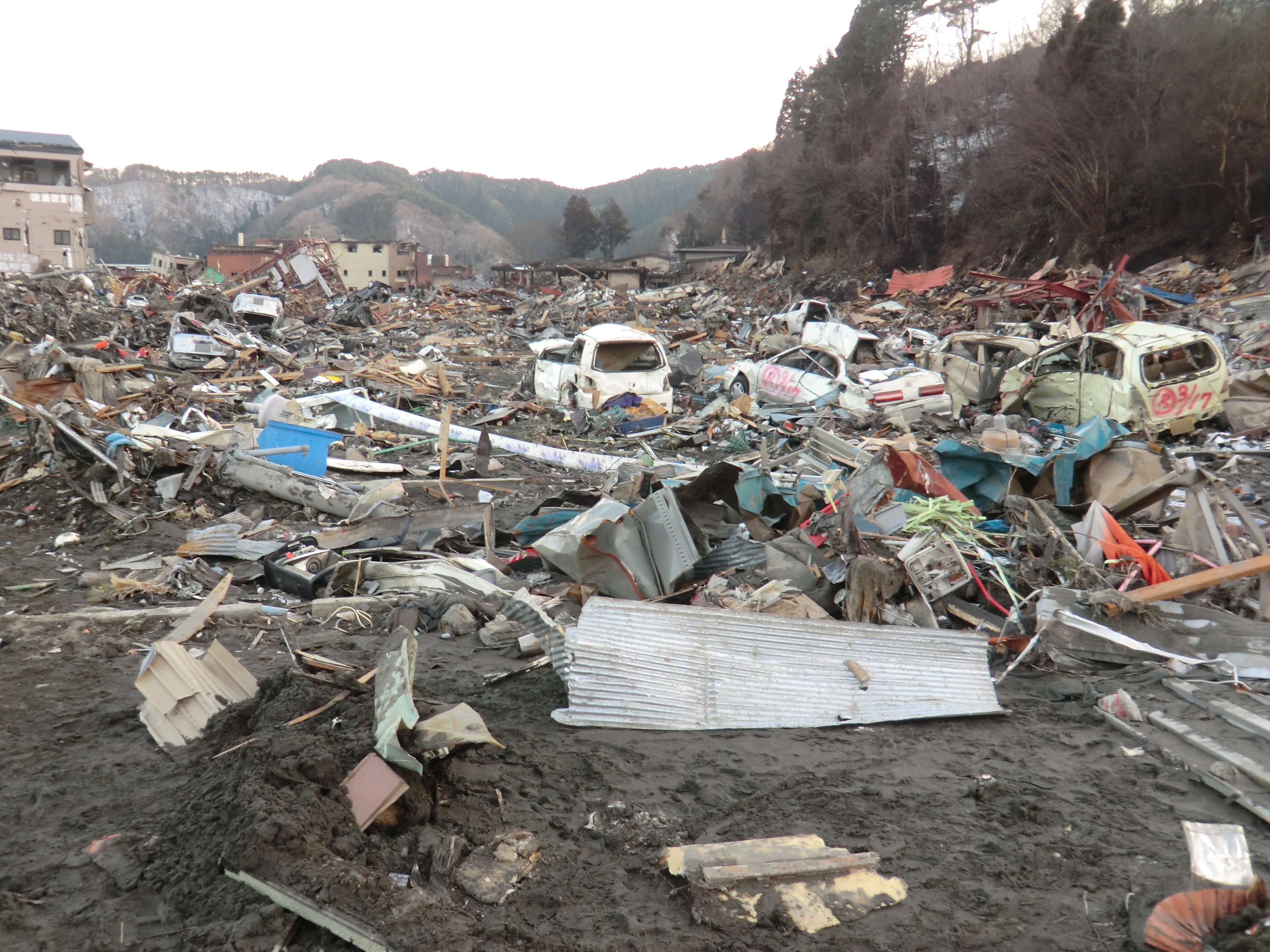 被災状況 拡大表示 ダウンロード 識別子 : 1532 タイトルよみ : ヒサイジョウキョウ 說明・要約 : 辺り一面ガレキ、土砂で埋め尽くされている様子 作成者(撮影者) : 堺市消防局 作成者(撮影者)よみ : サカイシショウボウキョク 提供者 : 堺市消防局 提供者よみ : サカイシショウボウキョク 撮影(作成)場所 : 岩手県上閉伊郡大槌町 末広町 撮影(作成)場所よみ : イワテケンカミヘイグンオオツチチョウ スエヒロチョウ 作成日・撮影日 : 2011年 3月 18日 カテゴリー : 物的被害 地域 : 町方地区 備考 : 堺市消防局提供 震災事象 捜索・救出活動 > 遺体捜索 救護 > 緊急消防救助隊でローラー作戦を実施。全国緊急消防隊の活動終了。