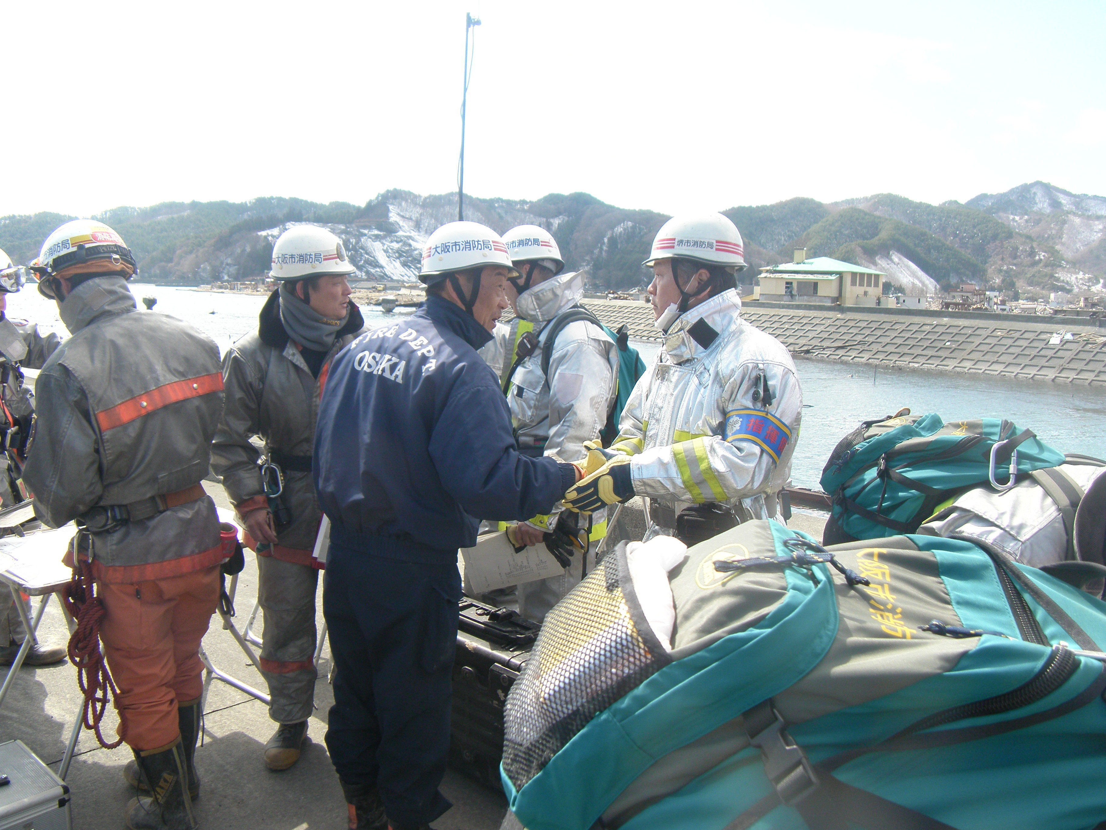 捜索活動の様子 拡大表示 ダウンロード 識別子 : 1553 タイトルよみ : ソウサクカツドウノヨウス 說明・要約 : テーブルを前に打合せをしている消防隊員の様子 作成者(撮影者) : 堺市消防局 作成者(撮影者)よみ : サカイシショウボウキョク 提供者 : 堺市消防局 提供者よみ : サカイシショウボウキョク 撮影(作成)場所 : 岩手県上閉伊郡大槌町 安渡 撮影(作成)場所よみ : イワテケンカミヘイグンオオツチチョウ アンド 作成日・撮影日 : 2011年 3月 18日 カテゴリー : 捜索 地域 : 安渡地区 備考 : 堺市消防局提供 震災事象 捜索・救出活動 > 遺体捜索 救護 > 緊急消防救助隊でローラー作戦を実施。全国緊急消防隊の活動終了。