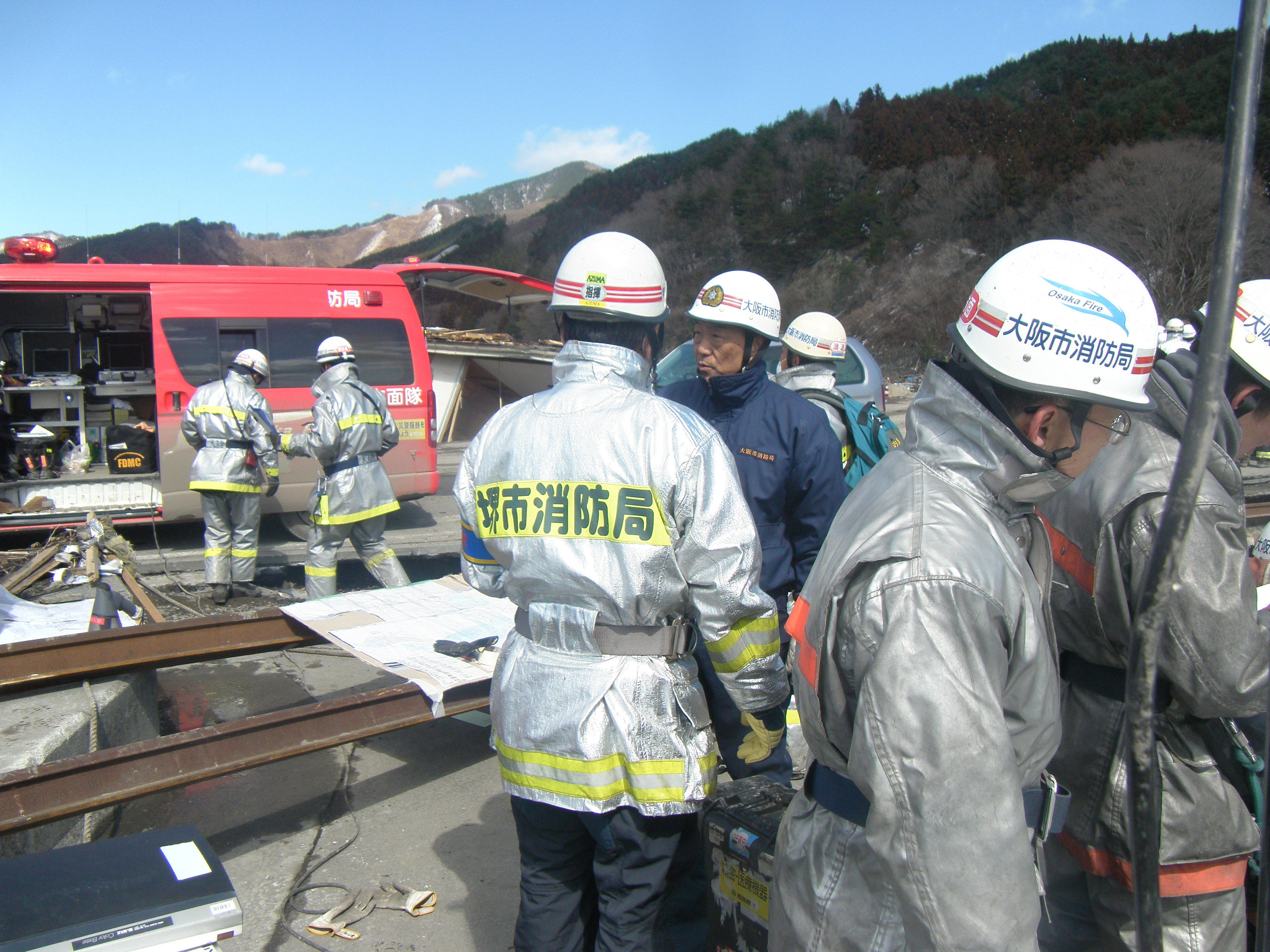 捜索活動の様子 拡大表示 ダウンロード 識別子 : 1555 タイトルよみ : ソウサクカツドウノヨウス 說明・要約 : テーブルを前に打合せをしている消防隊員と消防車両の様子 作成者(撮影者) : 堺市消防局 作成者(撮影者)よみ : サカイシショウボウキョク 提供者 : 堺市消防局 提供者よみ : サカイシショウボウキョク 撮影(作成)場所 : 岩手県上閉伊郡大槌町 安渡 撮影(作成)場所よみ : イワテケンカミヘイグンオオツチチョウ アンド 作成日・撮影日 : 2011年 3月 18日 カテゴリー : 捜索 地域 : 安渡地区 備考 : 堺市消防局提供 震災事象 捜索・救出活動 > 遺体捜索 救護 > 緊急消防救助隊でローラー作戦を実施。全国緊急消防隊の活動終了。
