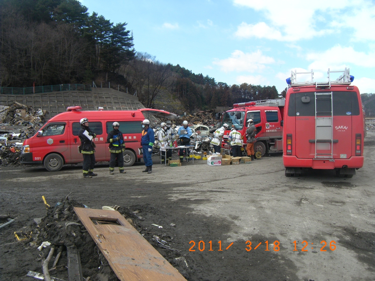 捜索活動の様子 拡大表示 ダウンロード 識別子 : 1571 タイトルよみ : ソウサクカツドウノヨウス 說明・要約 : 捜索活動をしている消防隊員と消防車両の様子 作成者(撮影者) : 堺市消防局 作成者(撮影者)よみ : サカイシショウボウキョク 提供者 : 堺市消防局 提供者よみ : サカイシショウボウキョク 撮影(作成)場所 : 岩手県上閉伊郡大槌町 末広町 撮影(作成)場所よみ : イワテケンカミヘイグンオオツチチョウ スエヒロチョウ 作成日・撮影日 : 2011年 3月 18日 カテゴリー : 捜索 地域 : 町方地区 備考 : 堺市消防局提供 震災事象 捜索・救出活動 > 遺体捜索 救護 > 緊急消防救助隊でローラー作戦を実施。全国緊急消防隊の活動終了。