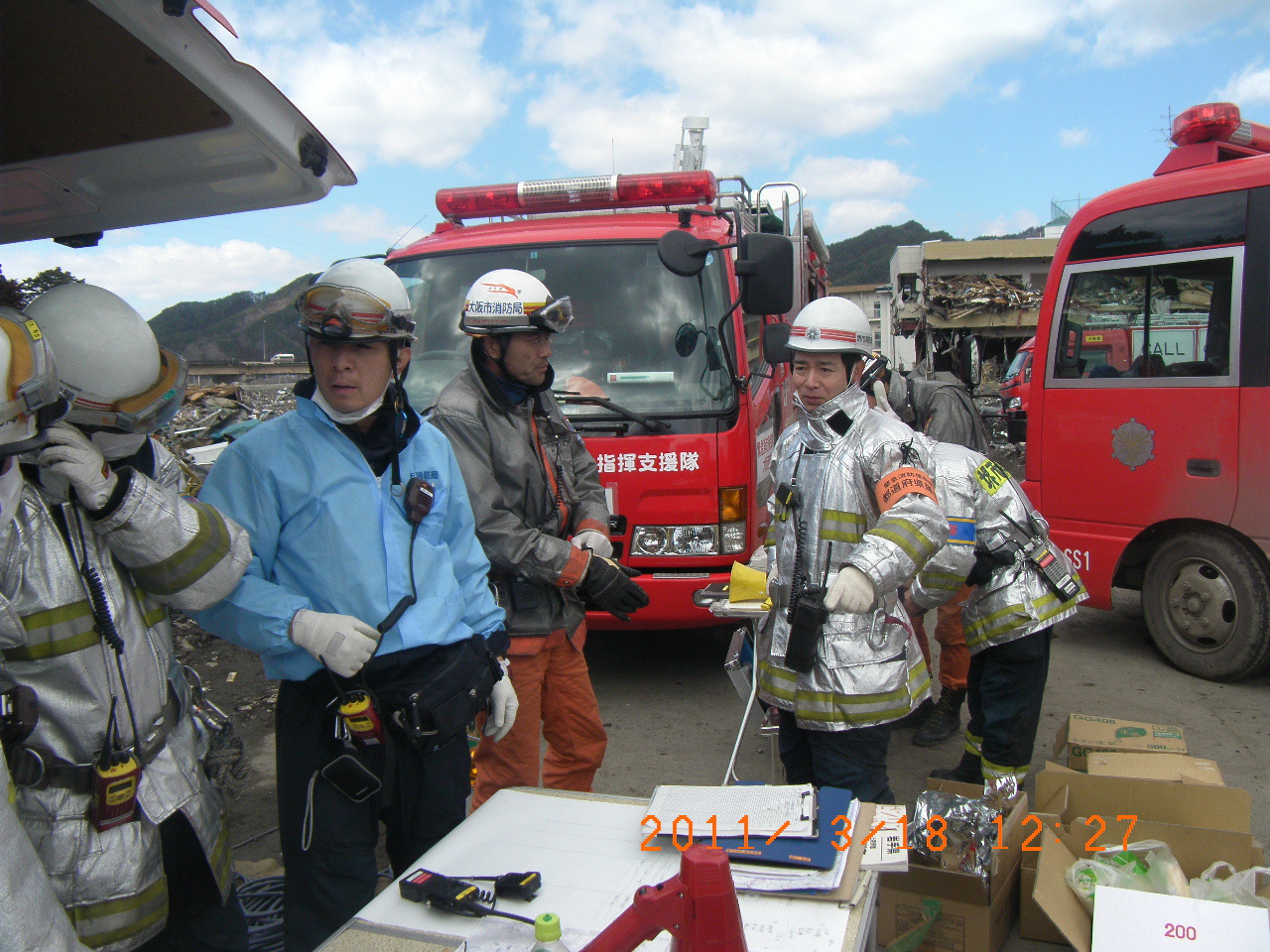 捜索活動の様子 拡大表示 ダウンロード 識別子 : 1574 タイトルよみ : ソウサクカツドウノヨウス 說明・要約 : テーブルを前に打合せをしている消防隊員と消防車両の様子 作成者(撮影者) : 堺市消防局 作成者(撮影者)よみ : サカイシショウボウキョク 提供者 : 堺市消防局 提供者よみ : サカイシショウボウキョク 撮影(作成)場所 : 岩手県上閉伊郡大槌町 末広町 撮影(作成)場所よみ : イワテケンカミヘイグンオオツチチョウ スエヒロチョウ 作成日・撮影日 : 2011年 3月 18日 カテゴリー : 捜索 地域 : 町方地区 備考 : 堺市消防局提供 震災事象 捜索・救出活動 > 遺体捜索 救護 > 緊急消防救助隊でローラー作戦を実施。全国緊急消防隊の活動終了。