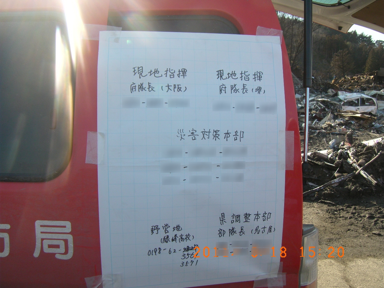 捜索活動の様子 拡大表示 ダウンロード 識別子 : 1577 タイトルよみ : ソウサクカツドウノヨウス 說明・要約 : 指揮隊長、対策本部、野営地、県調整本部隊長の連絡先が記されてある消防車両に貼ってある模造紙 作成者(撮影者) : 堺市消防局 作成者(撮影者)よみ : サカイシショウボウキョク 提供者 : 堺市消防局 提供者よみ : サカイシショウボウキョク 撮影(作成)場所 : 岩手県上閉伊郡大槌町 末広町 撮影(作成)場所よみ : イワテケンカミヘイグンオオツチチョウ スエヒロチョウ 作成日・撮影日 : 2011年 3月 18日 カテゴリー : 捜索 地域 : 町方地区 備考 : 堺市消防局提供 震災事象 捜索・救出活動 > 遺体捜索 救護 > 緊急消防救助隊でローラー作戦を実施。全国緊急消防隊の活動終了。