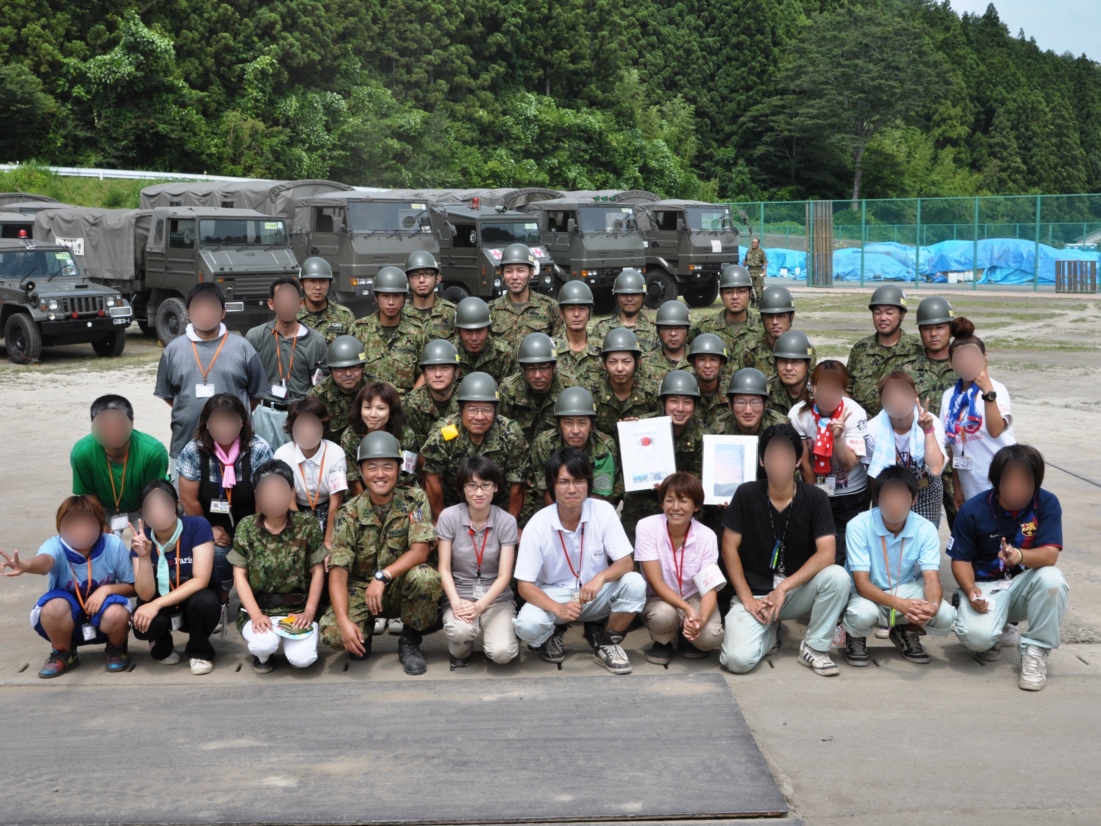 災害支援の基地を撤収するにあたり周辺整備が終わった後の自衛隊員と関係者の集合写真