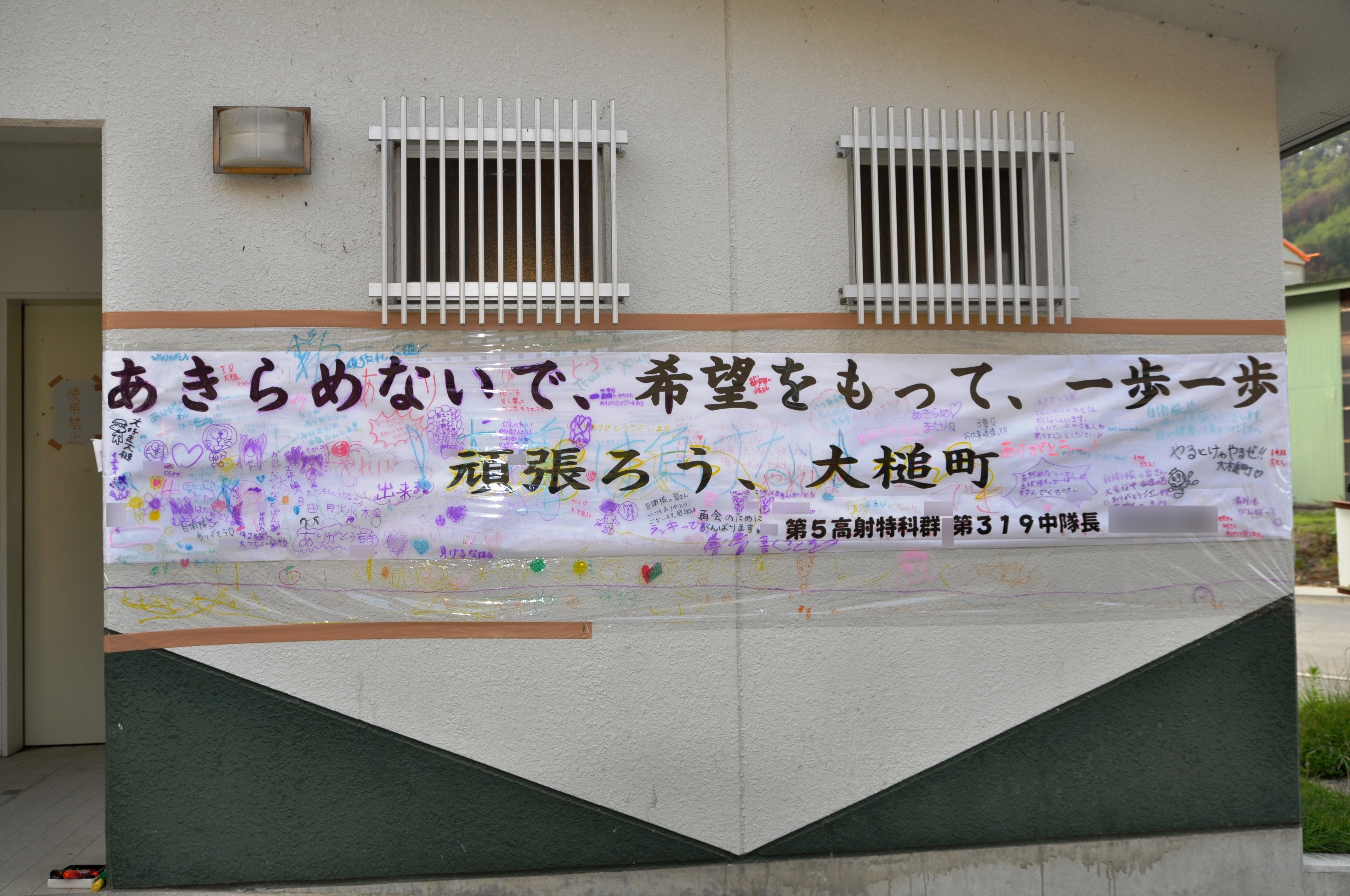 自衛隊から被災者への応援メッセージとそれに追記された関係者のメッセージが書かれた横断幕