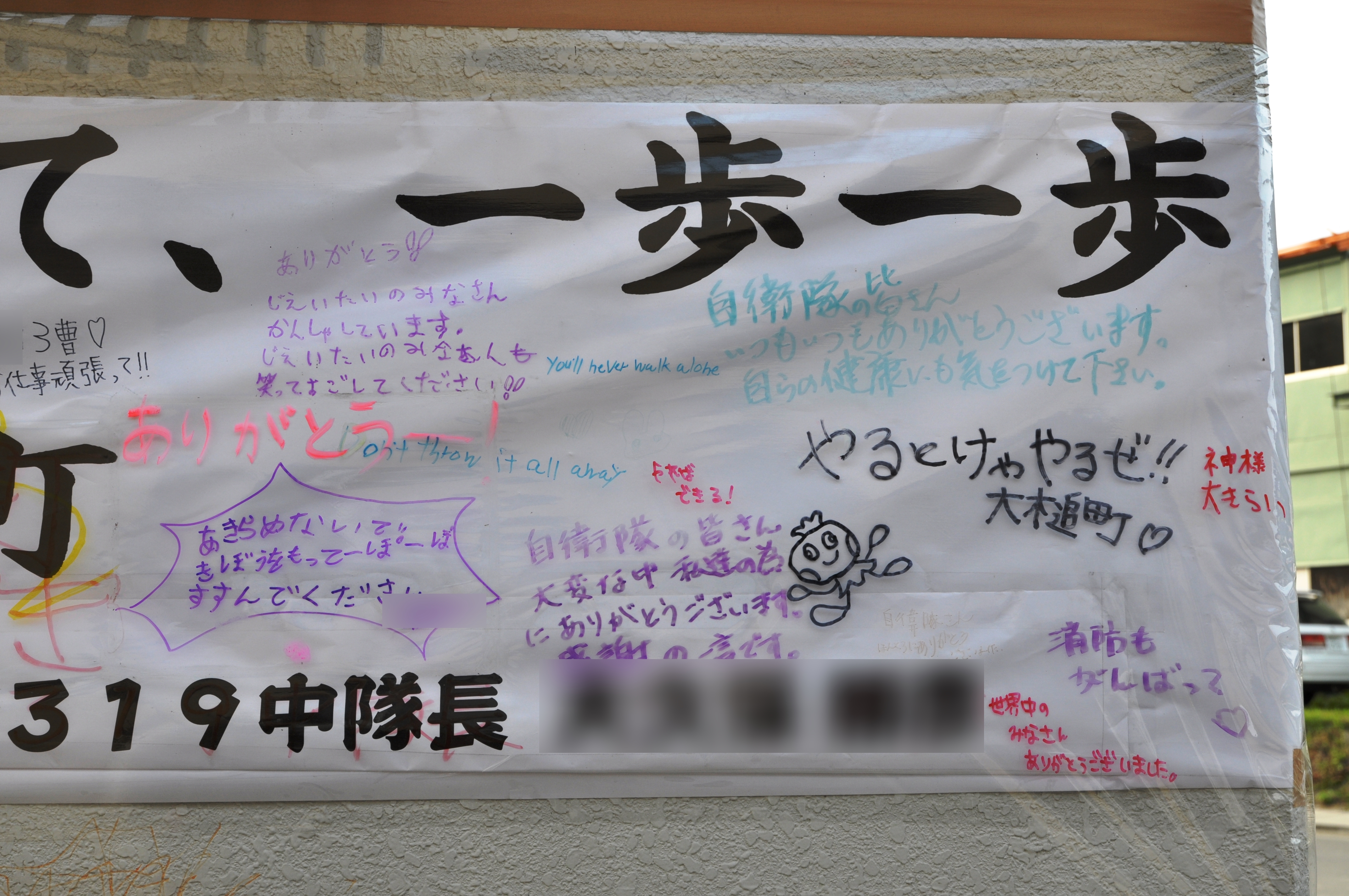 自衛隊から被災者への応援メッセージとそれに追記された関係者のメッセージが書かれた横断幕