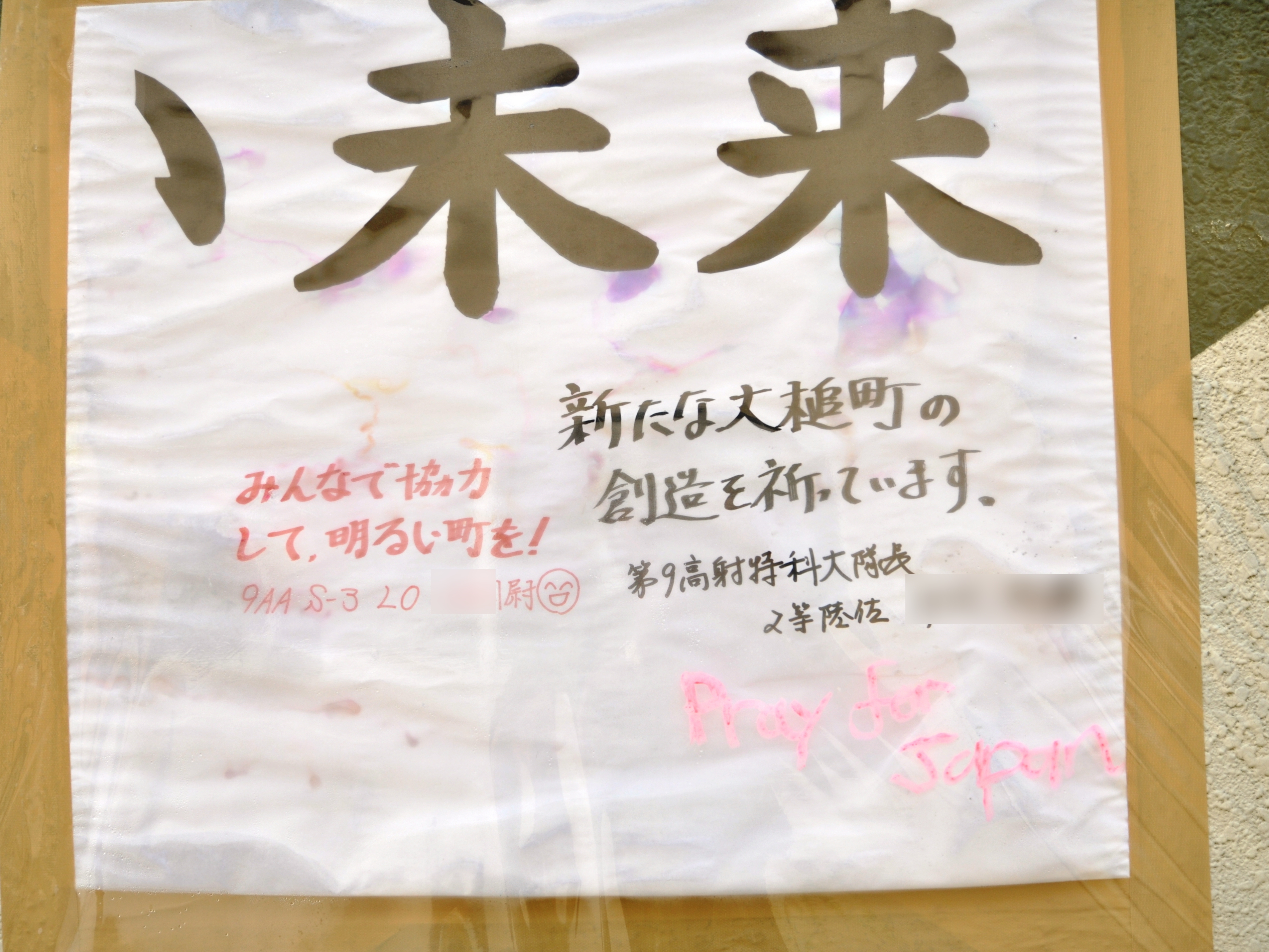 自衛隊から被災者への応援メッセージとそれに追記された関係者のメッセージが書かれた横断幕