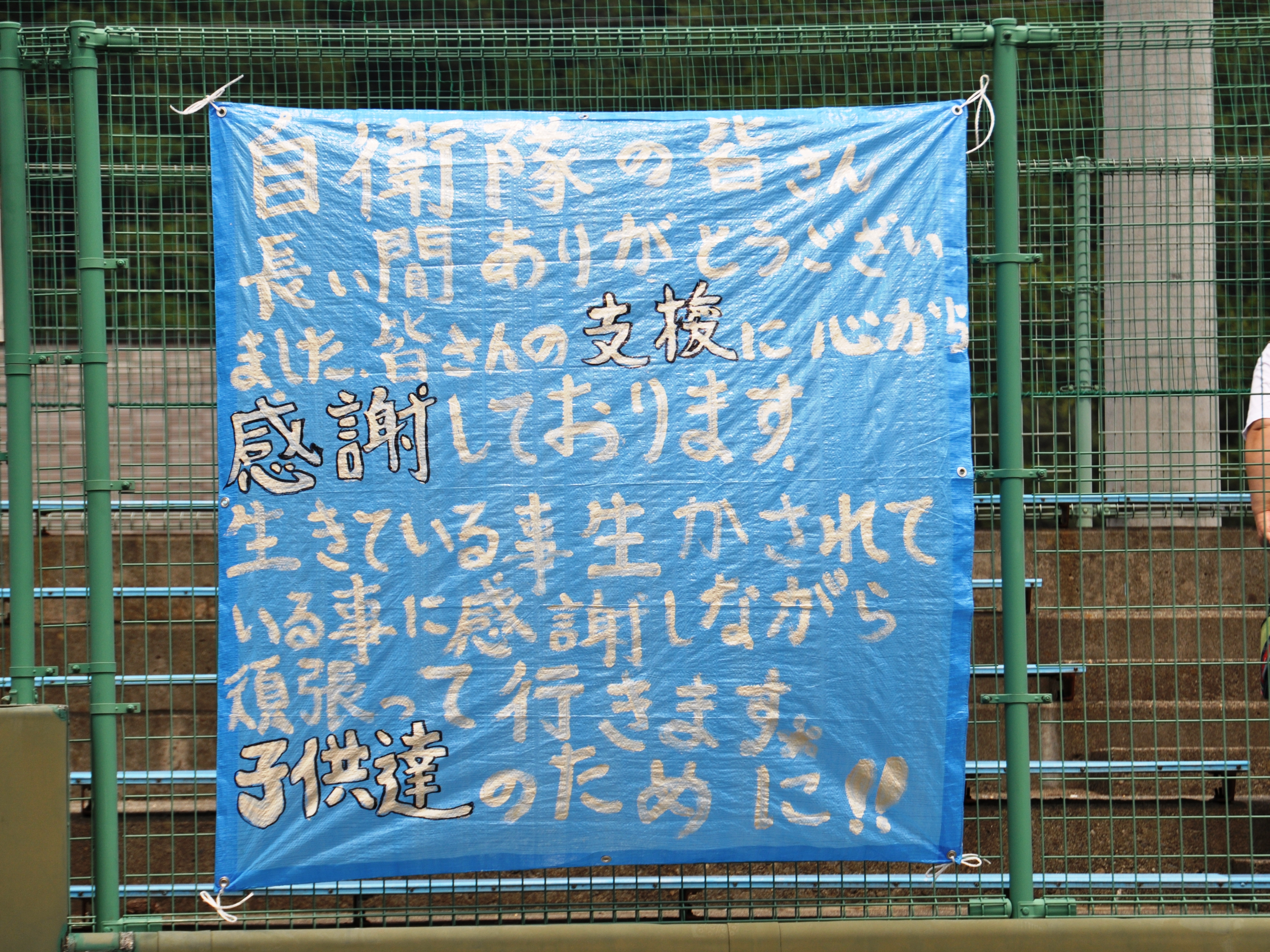 自衛隊への感謝のメッセージが書かれたシートが掲示されている様子