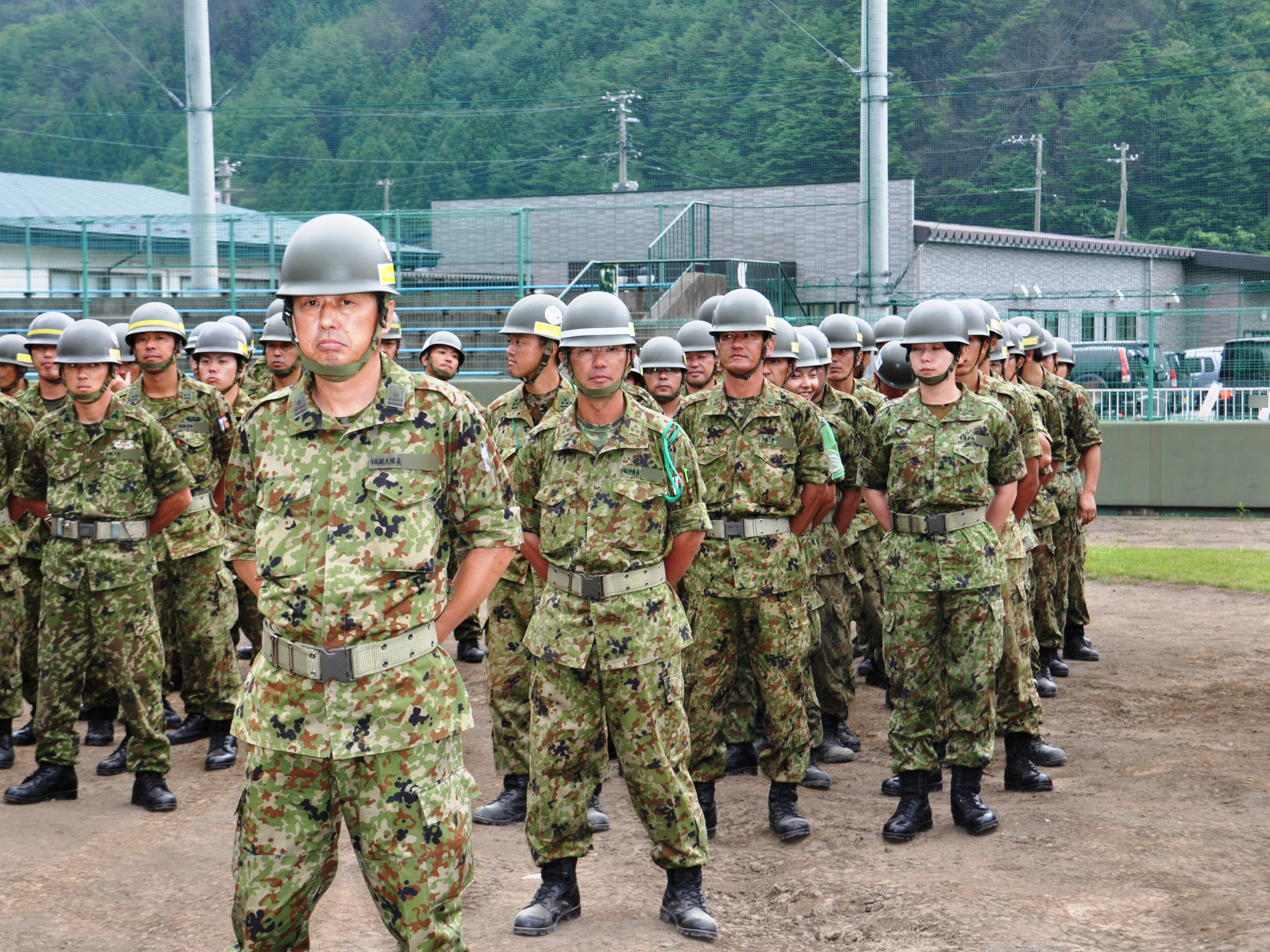 セレモニー開始前にグランドに整列した自衛隊員の様子