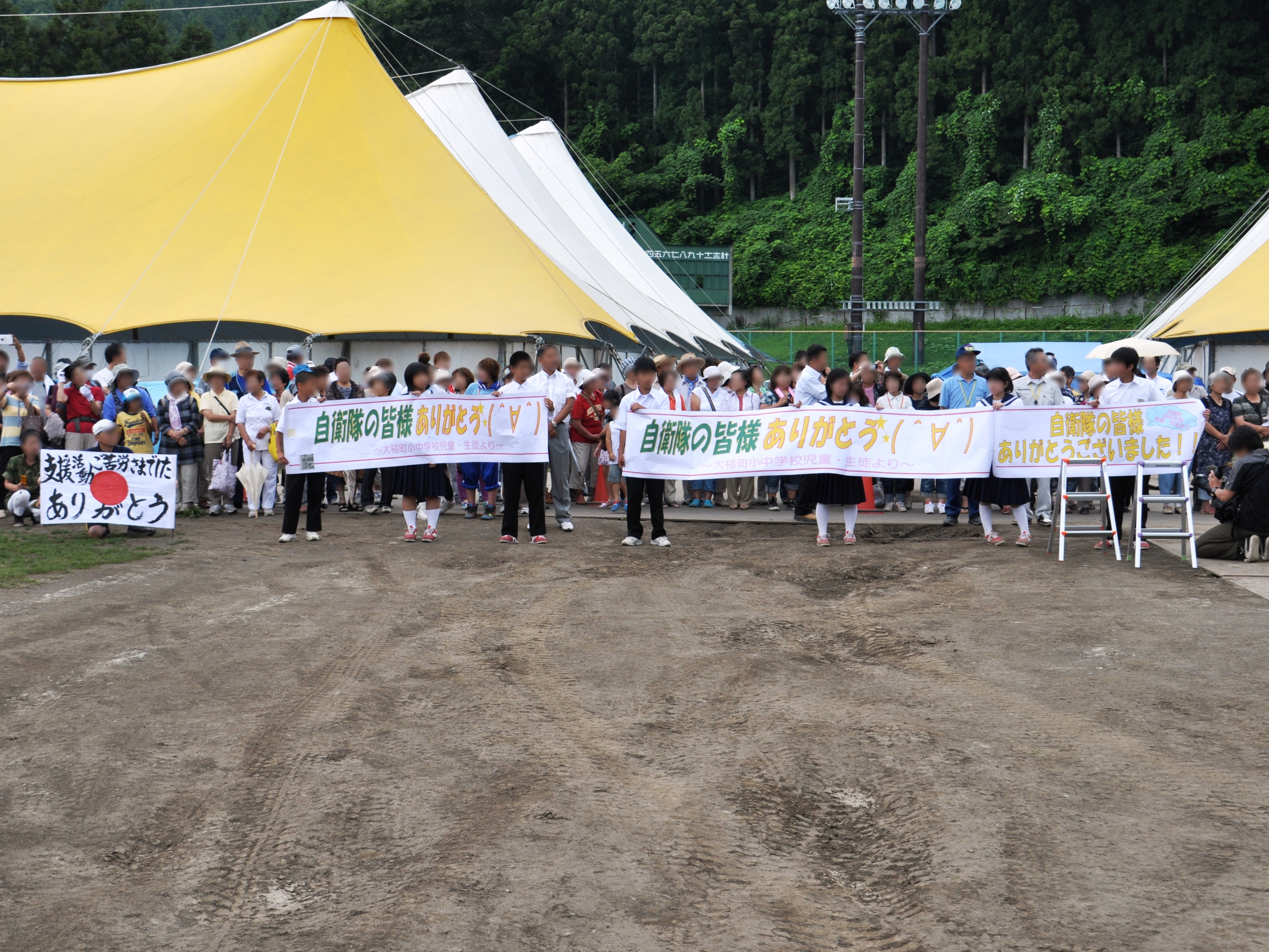 自衛隊への感謝のメッセージを書いた横断幕を持っている地元の方の様子