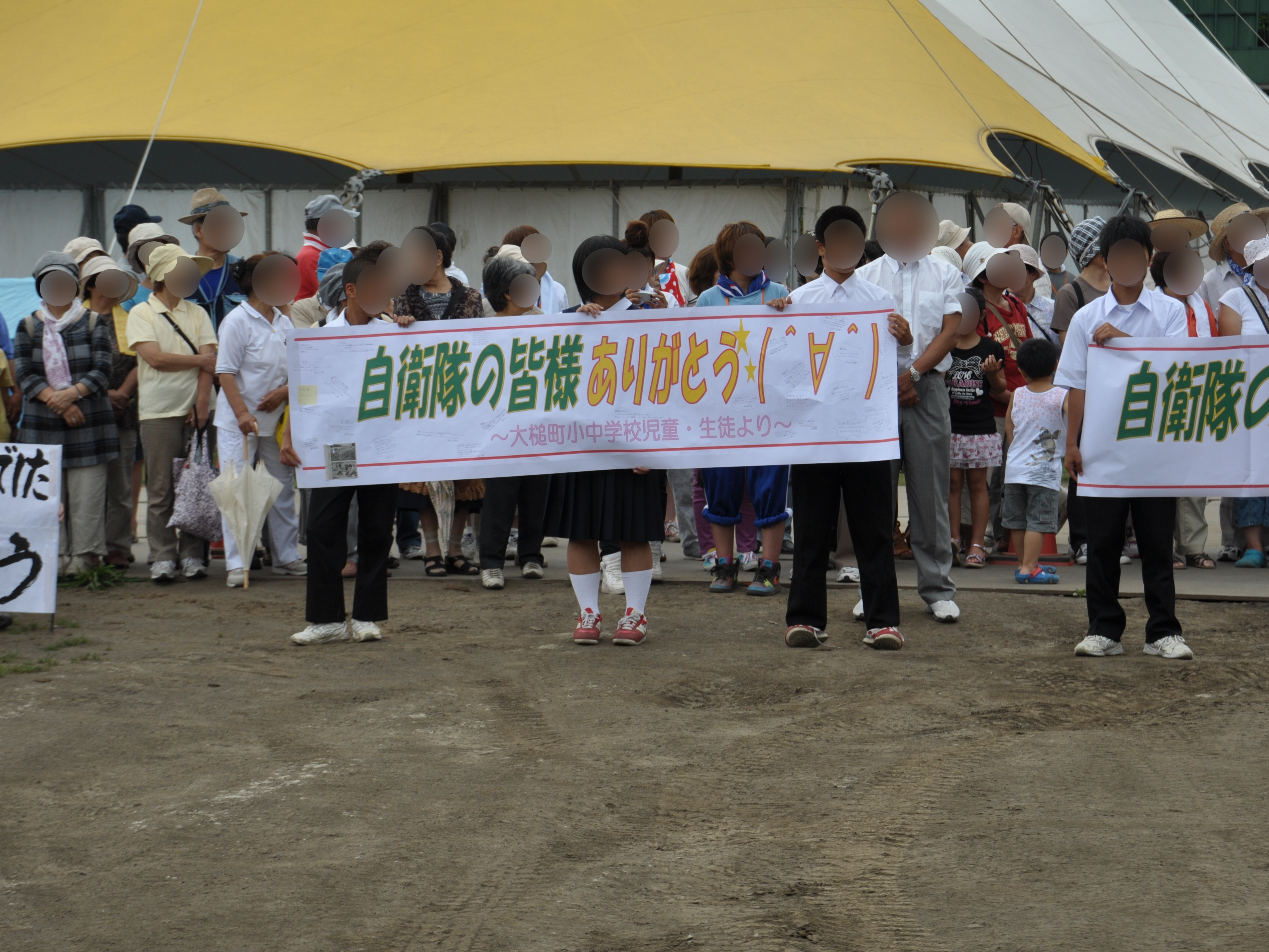 自衛隊への感謝のメッセージを書いた横断幕を持っている地元の方の様子