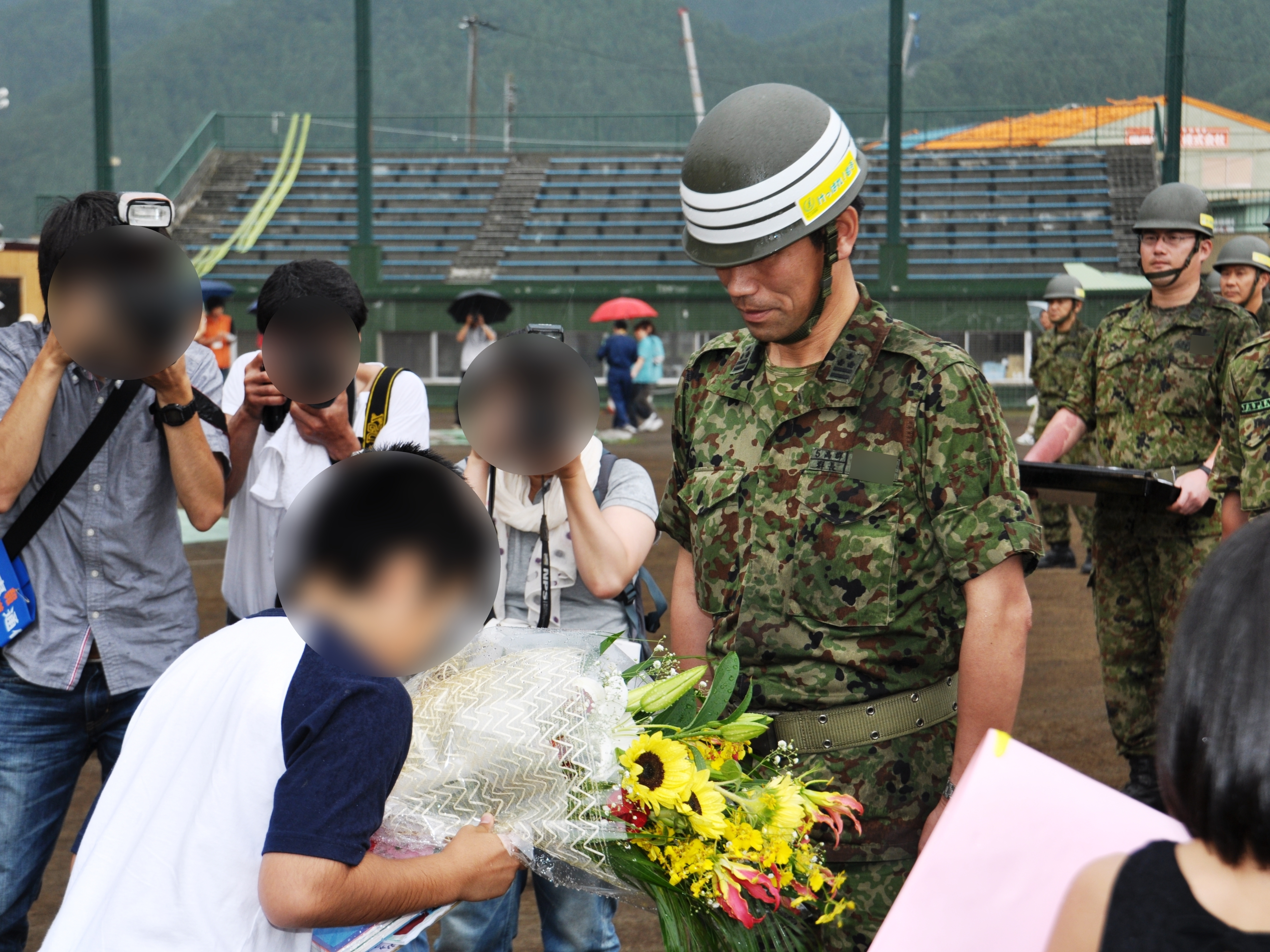 子供たちから自衛隊員へ花束、記念品を贈っている様子