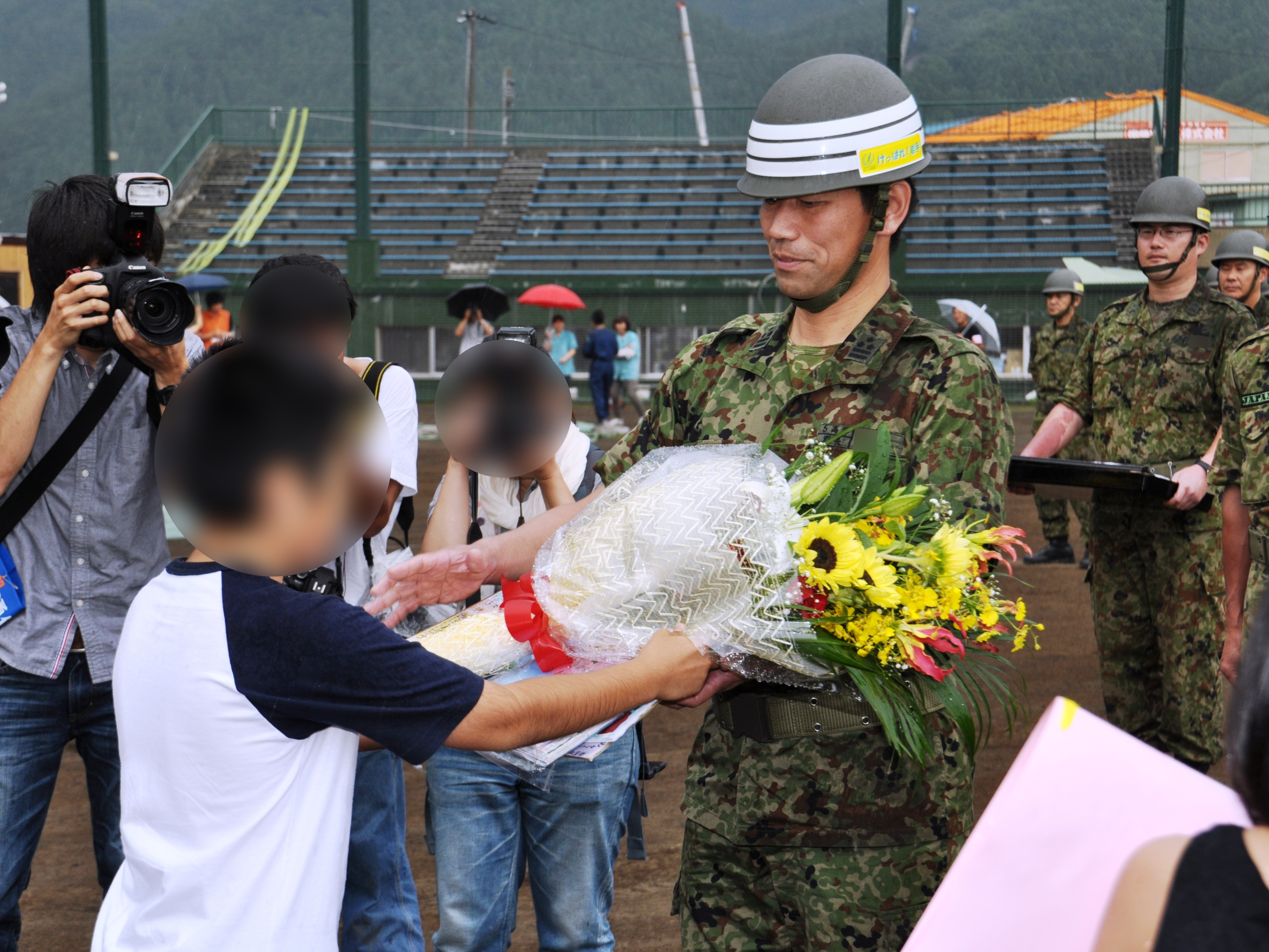 子供たちから自衛隊員へ花束、記念品を贈っている様子