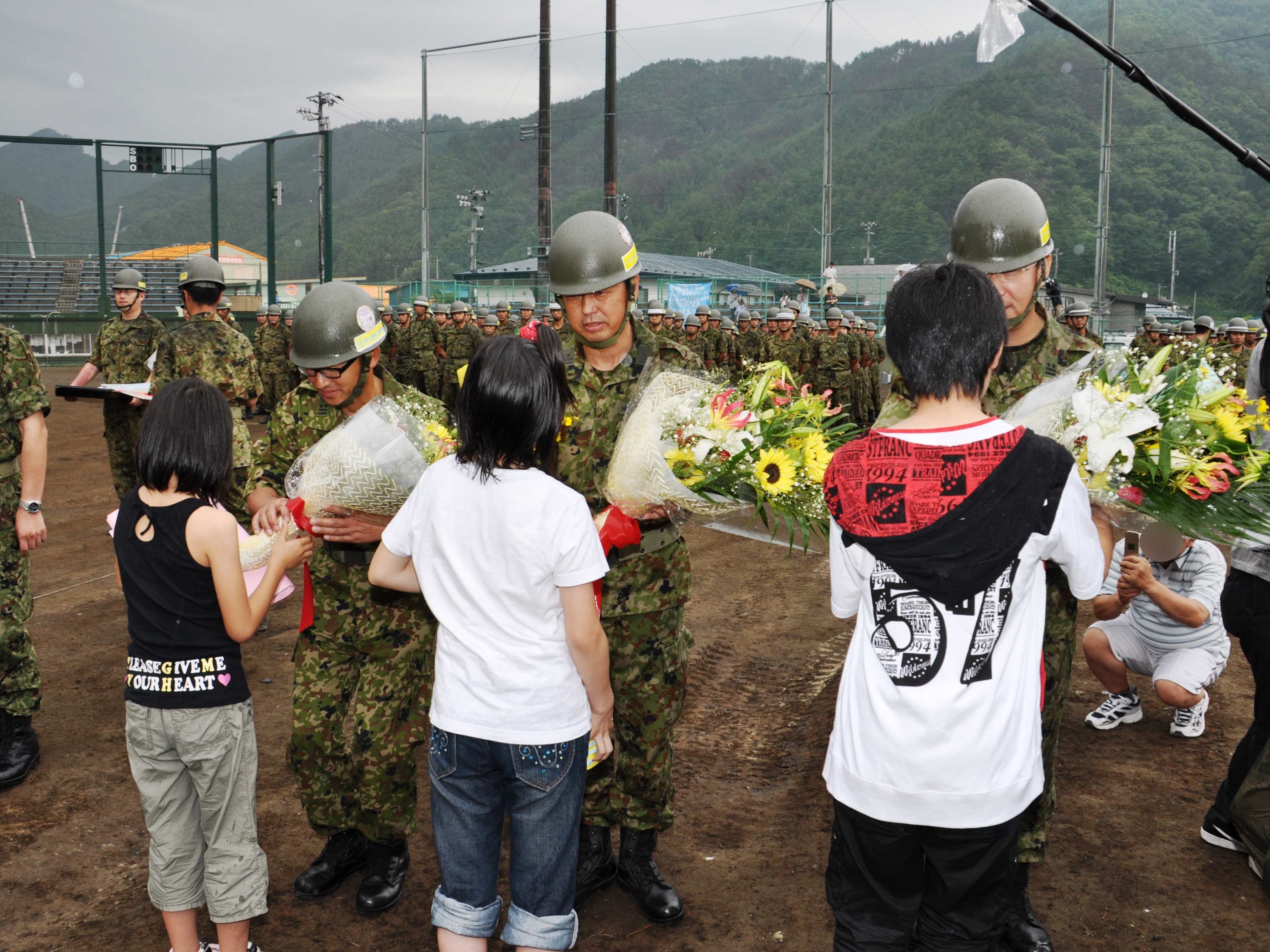 子供たちから自衛隊員へ花束、記念品を贈っている様子