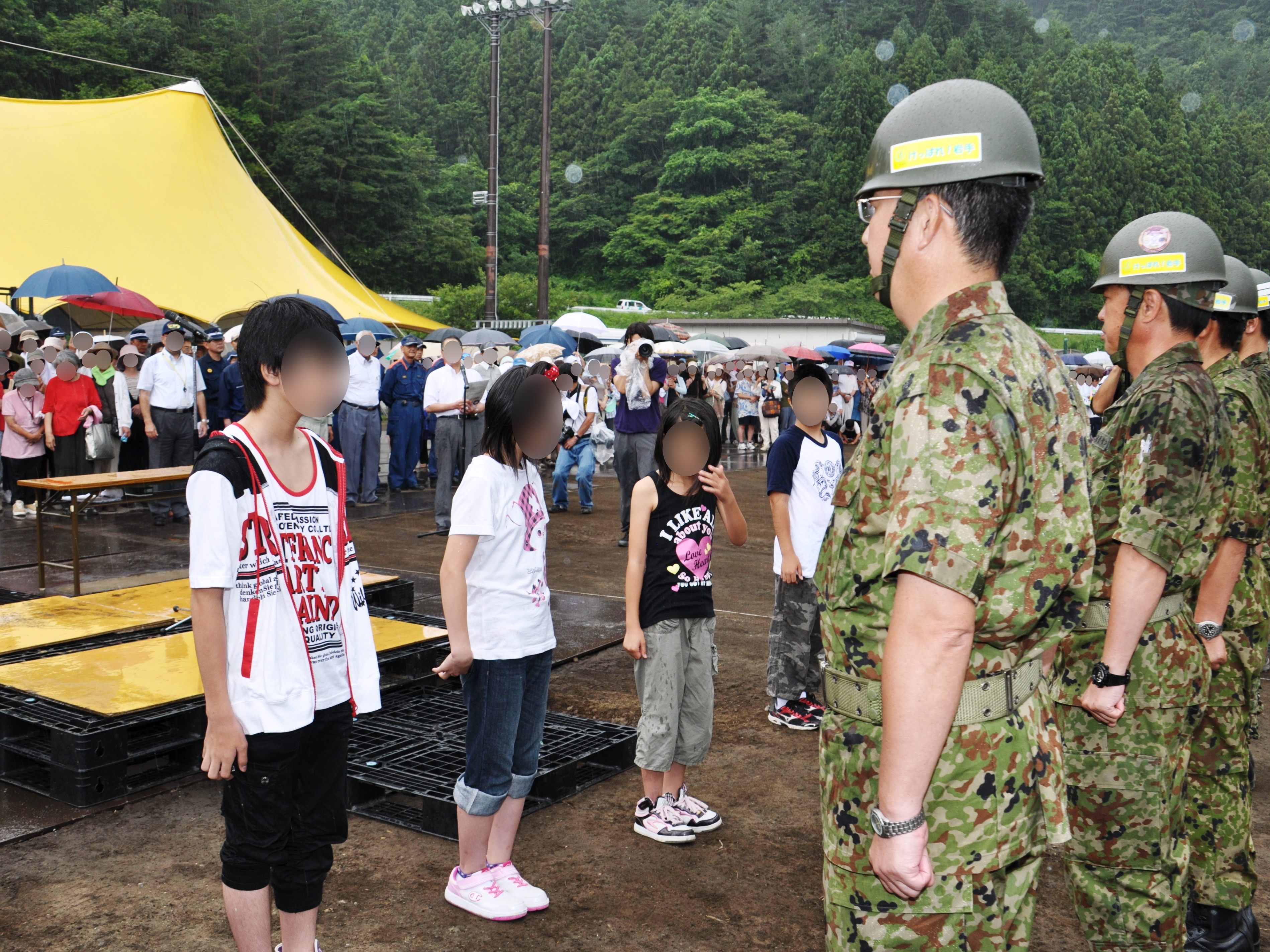 子供たちから自衛隊員へ花束、記念品を贈っている様子