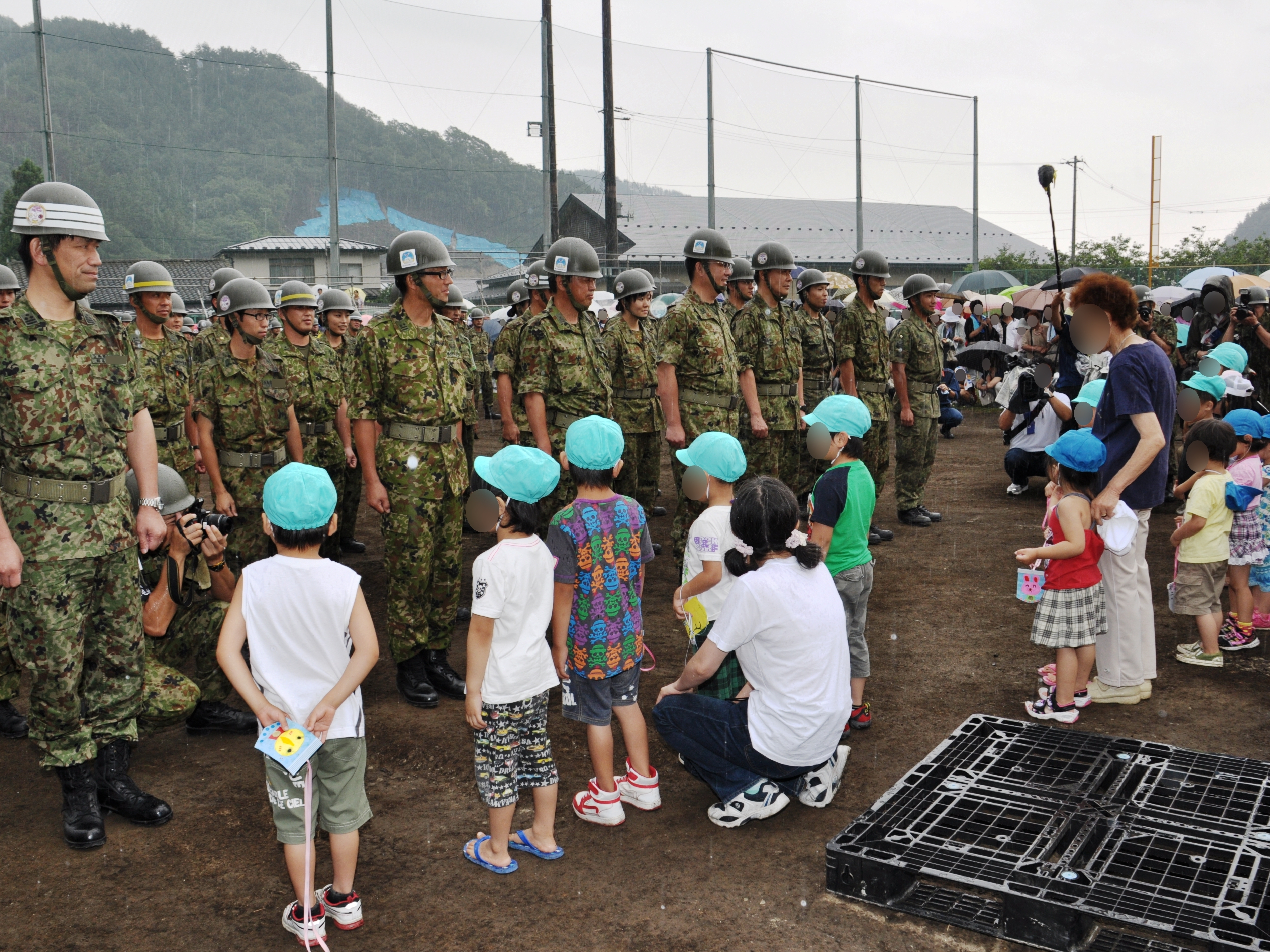 子供たちから自衛隊員へ花束、記念品を贈っている様子