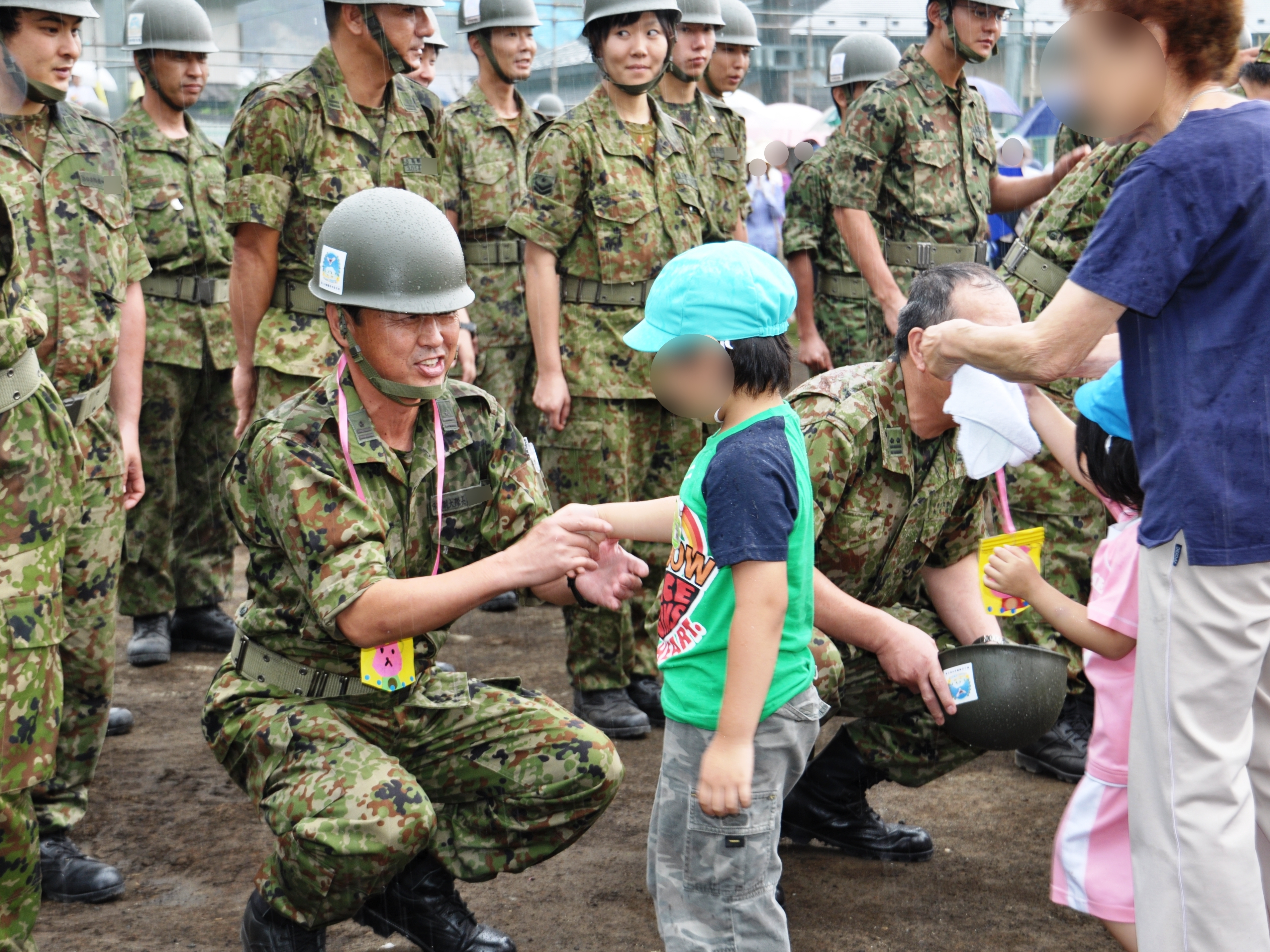 子供たちから自衛隊員へ花束、記念品を贈っている様子