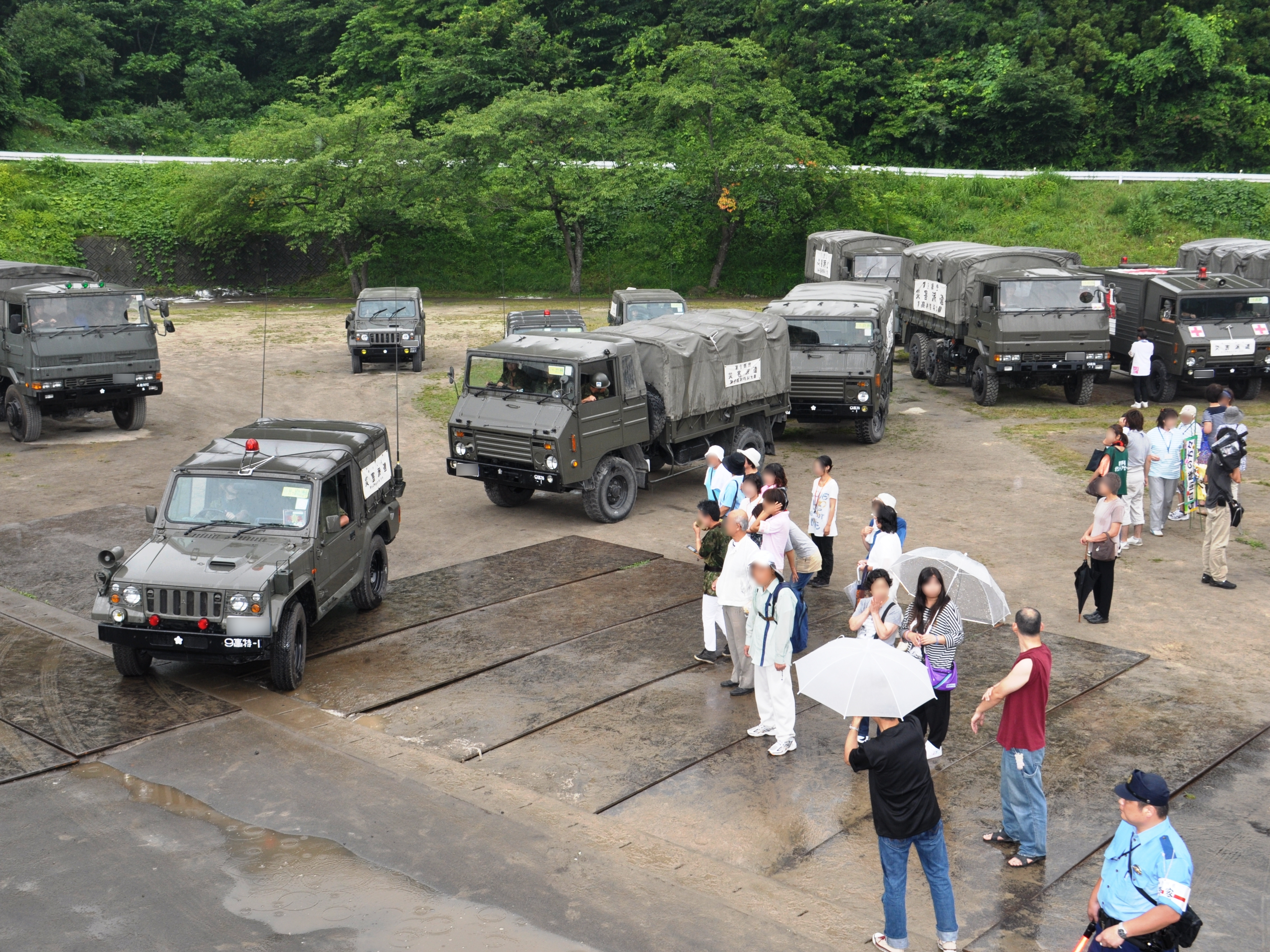 車で隊列を組んで撤退する自衛隊と雨の中それを見送る地元の方たちの様子