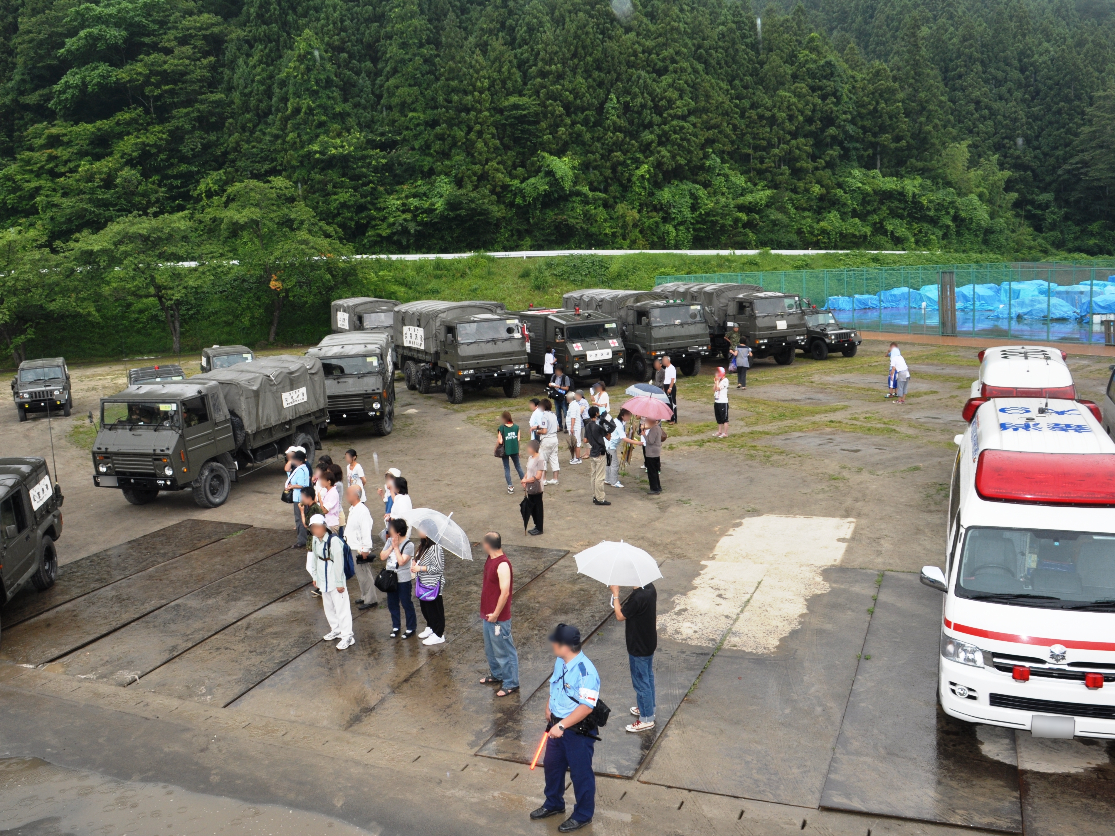 車で隊列を組んで撤退する自衛隊と雨の中それを見送る地元の方たちの様子